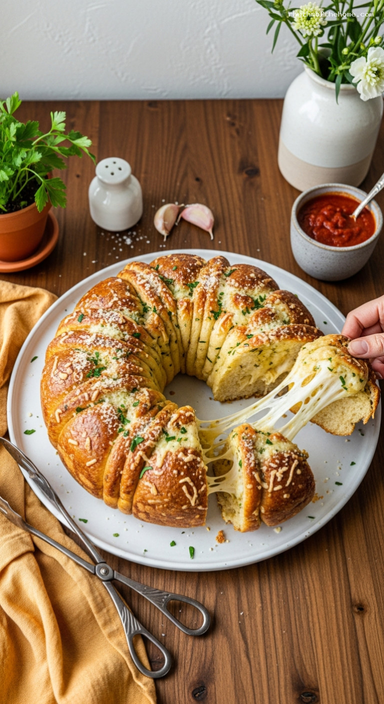 Bake for 35 minutes, until deep golden brown and the center registers 195–200°F (90–93°C) on an instant-read thermometer. If the top browns too quickly, tent loosely with foil during the last 10 minutes. Cool in the pan for 10 minutes, then invert onto a serving plate. Brush with 1–2 tbsp melted butter and scatter extra parsley. Serve warm, pulling apart at the table; marinara on the side is excellent.