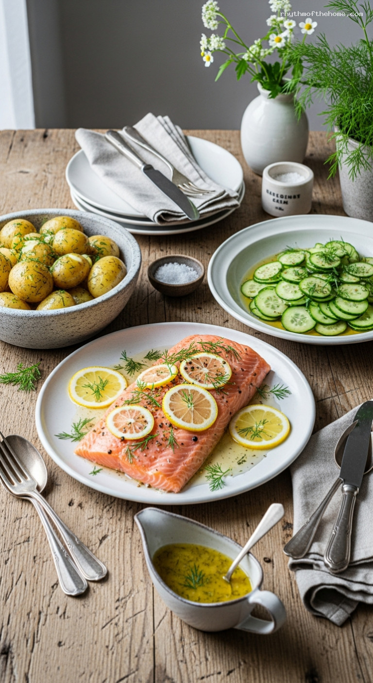 - Balanced plate: buttery new potatoes, crisp-sweet cucumber salad, and tangy dill-mustard sauce.