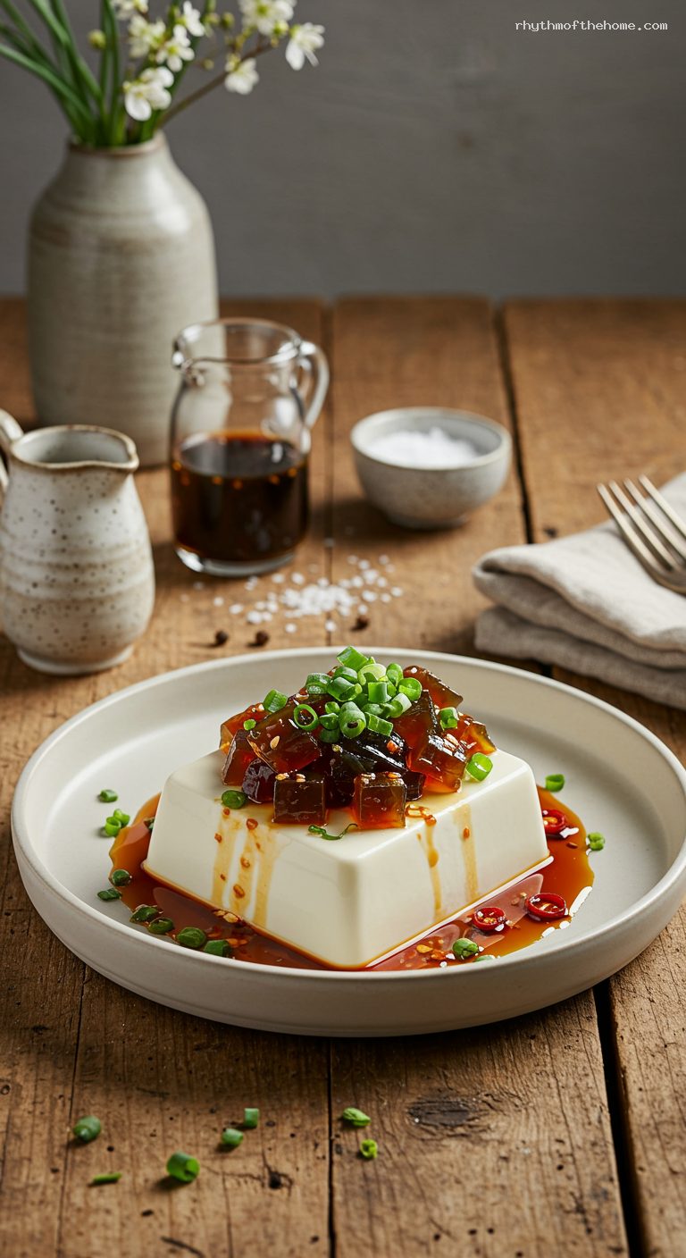Serve immediately while chilled. Provide a large spoon for scooping soft tofu with toppings and sauce. This pairs beautifully with plain congee, steamed rice, or light stir-fried greens.
