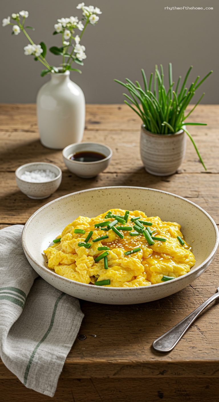 Return the chives to the pan. Drizzle in the remaining 1/2 tsp light soy sauce and the toasted sesame oil. Gently toss and fold for 10–15 seconds until the eggs are barely set, glossy, and still a touch soft. Remove from heat immediately; the residual heat will finish them.