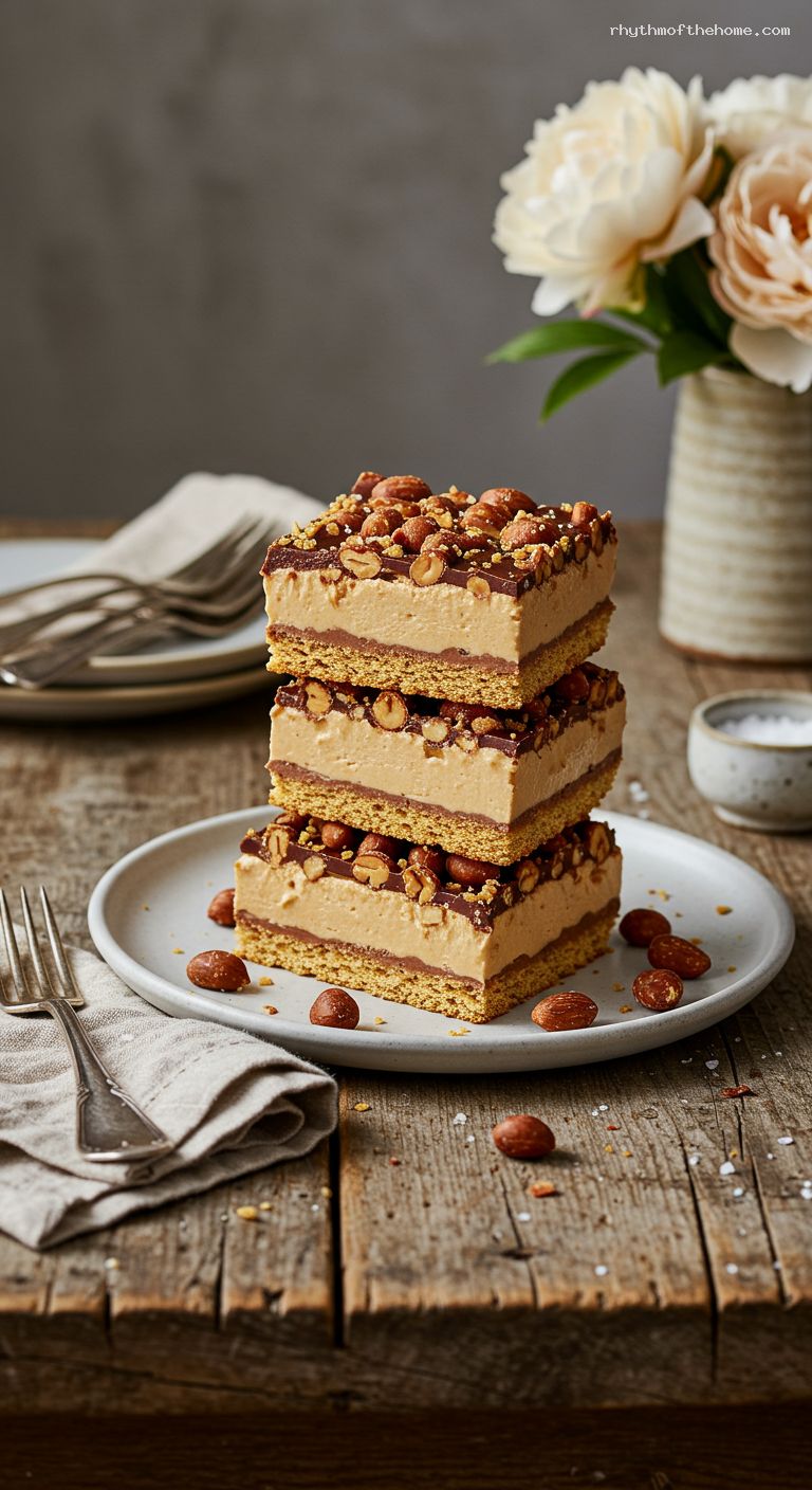 - No-bake showstopper: layers of graham crackers, plush peanut butter cream, and glossy ganache.
