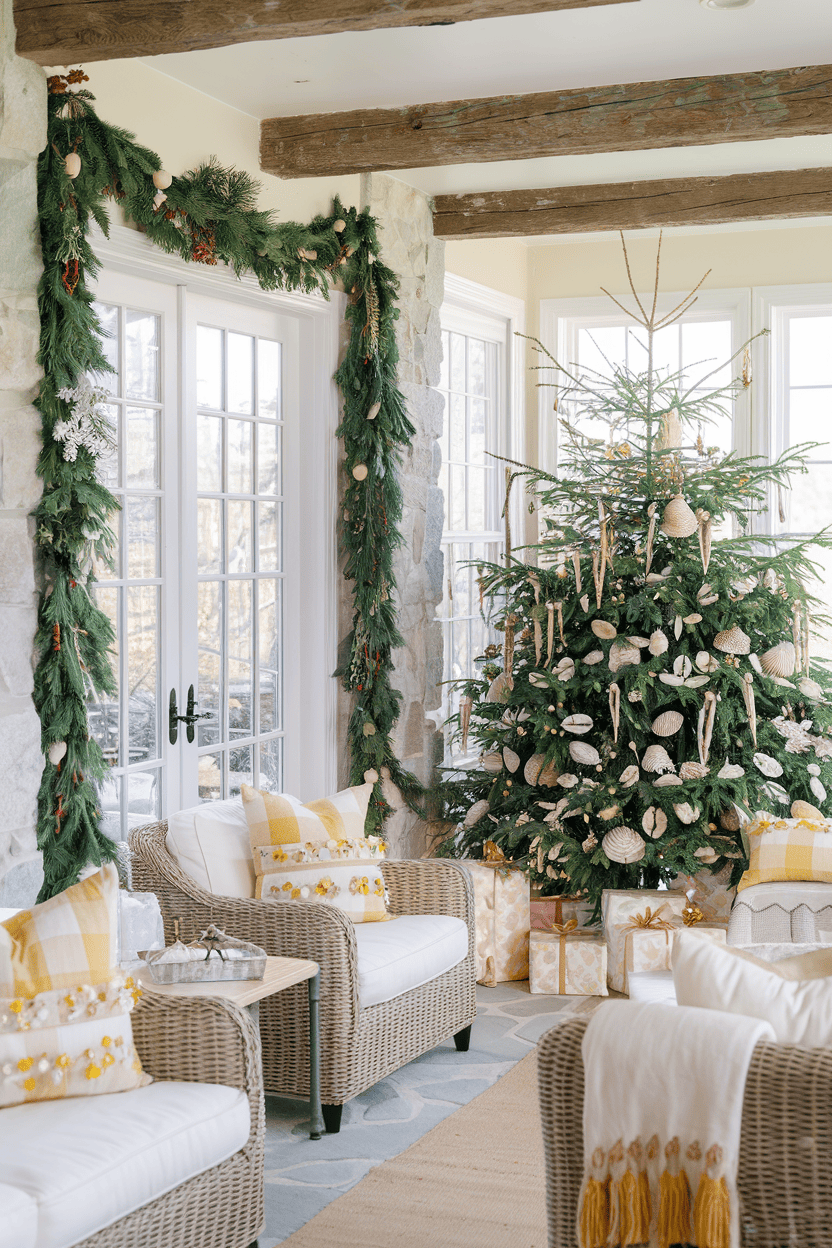 This sun-drenched coastal-inspired space masterfully blends rustic and elegant elements, featuring exposed wooden beams against crisp white walls and French doors that flood the room with natural light. The sophisticated holiday décor scheme employs a serene palette of whites and neutrals, with a striking Christmas tree adorned in seashells and natural ornaments, complemented by fresh evergreen garlands framing the windows. The seating area showcases comfortable wicker armchairs with plush white cushions, accented by yellow buffalo check pillows and throws, creating an inviting coastal Christmas retreat that feels both elevated and welcoming.