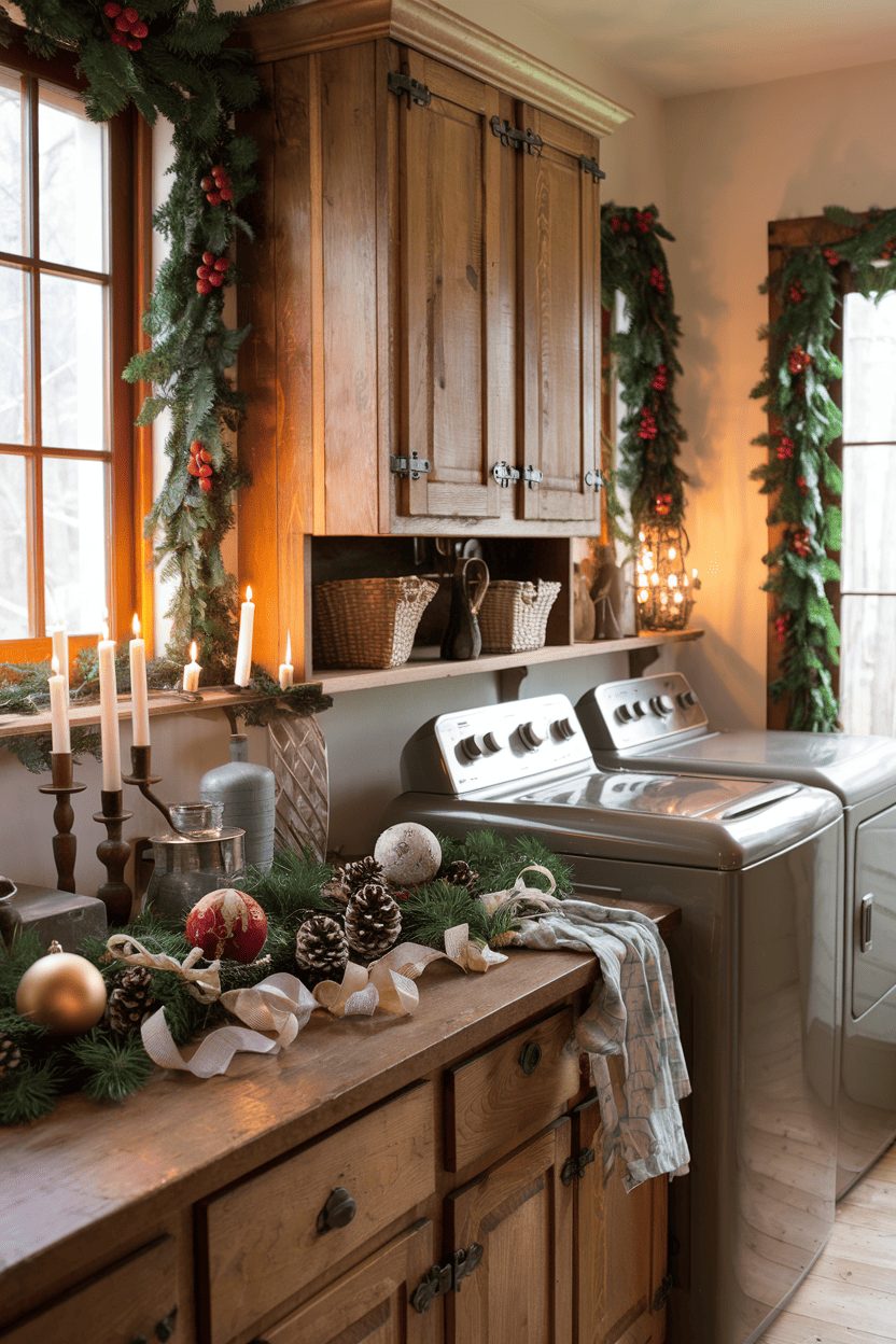 This charming laundry room embodies rustic elegance with its traditional wood cabinetry and vintage-inspired hardware, expertly transformed into a festive space through thoughtful holiday styling. The room’s focal points include a beautifully decorated wooden counter adorned with classic Christmas elements – pinecones, ornaments, and taper candles in brass holders – while fresh evergreen garlands with red berries frame the windows, creating an enchanting glow when paired with candlelight. The practical aspects of the space, including modern appliances, are seamlessly integrated with woven storage baskets and natural wood elements, proving that even utilitarian spaces can be infused with seasonal warmth and sophistication.
