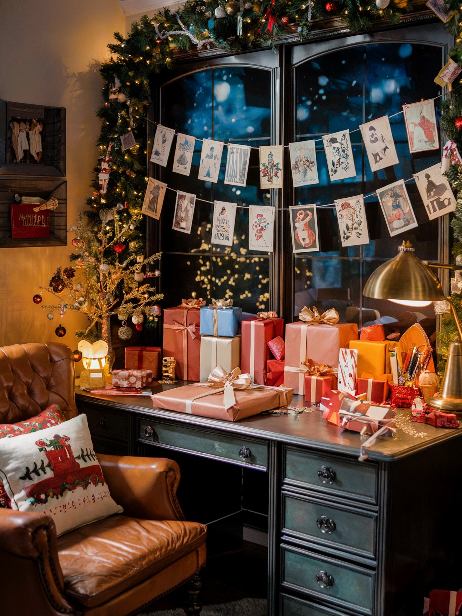 This cozy workspace is transformed into a festive haven, with a collection of wrapped gifts adorning the desk, a garland draped above, and a vintage-inspired garland of holiday cards adding a touch of nostalgia. The leather armchair provides a comfortable spot to relax and enjoy the holiday cheer, while the warm lighting creates a welcoming ambiance. This space is the perfect example of how to incorporate festive touches into a functional workspace.