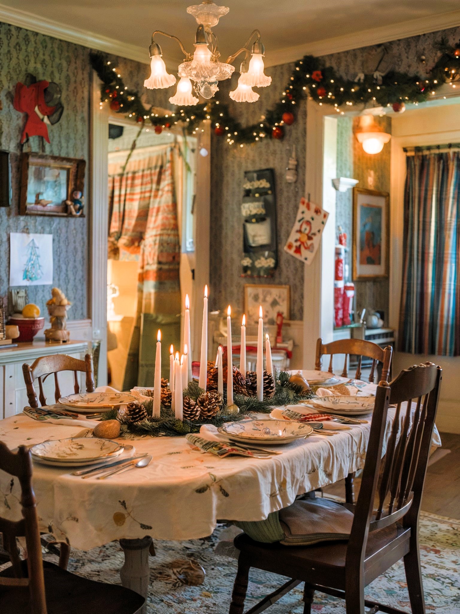 This classic dining room exudes a warm and inviting atmosphere, with its vintage wallpaper, cozy seating, and a festive table setting that evokes the spirit of Christmas. The centerpiece of the room is the beautifully decorated dining table, adorned with candles, pinecones, and a festive tablecloth. The overall effect is a timeless and charming space perfect for family gatherings and holiday celebrations.