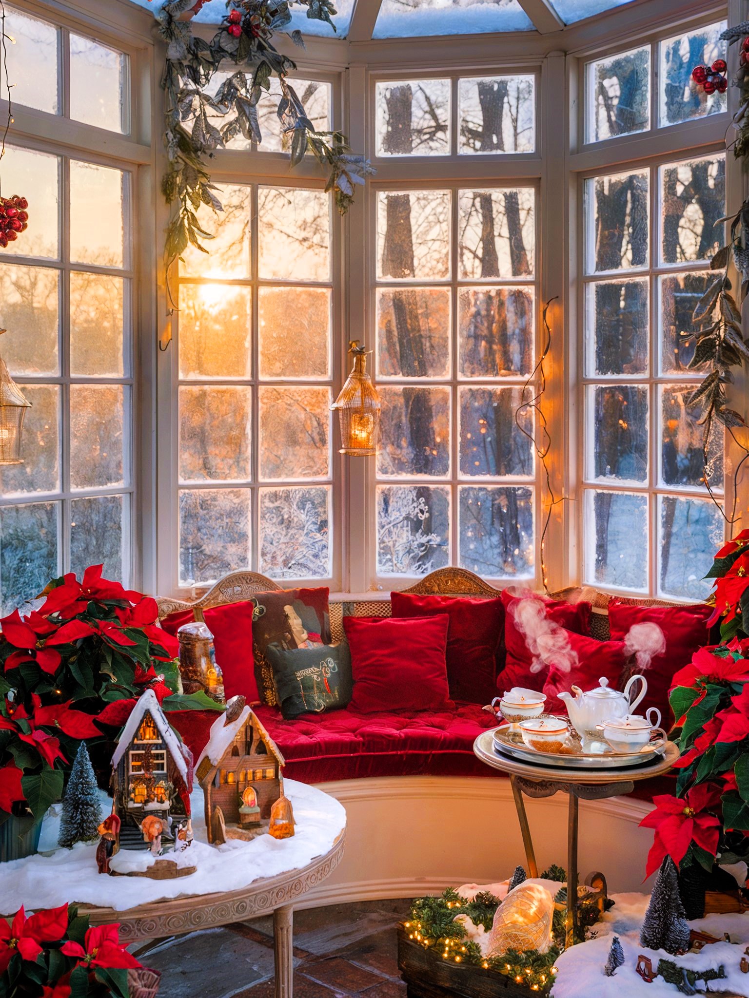 This sunroom is a picture of festive elegance, with its plush red banquette, inviting coffee table, and a curated collection of holiday decor. The large windows frame a breathtaking winter scene, bringing the beauty of the season indoors. The overall effect is a warm and inviting atmosphere perfect for entertaining guests or simply enjoying a quiet moment.