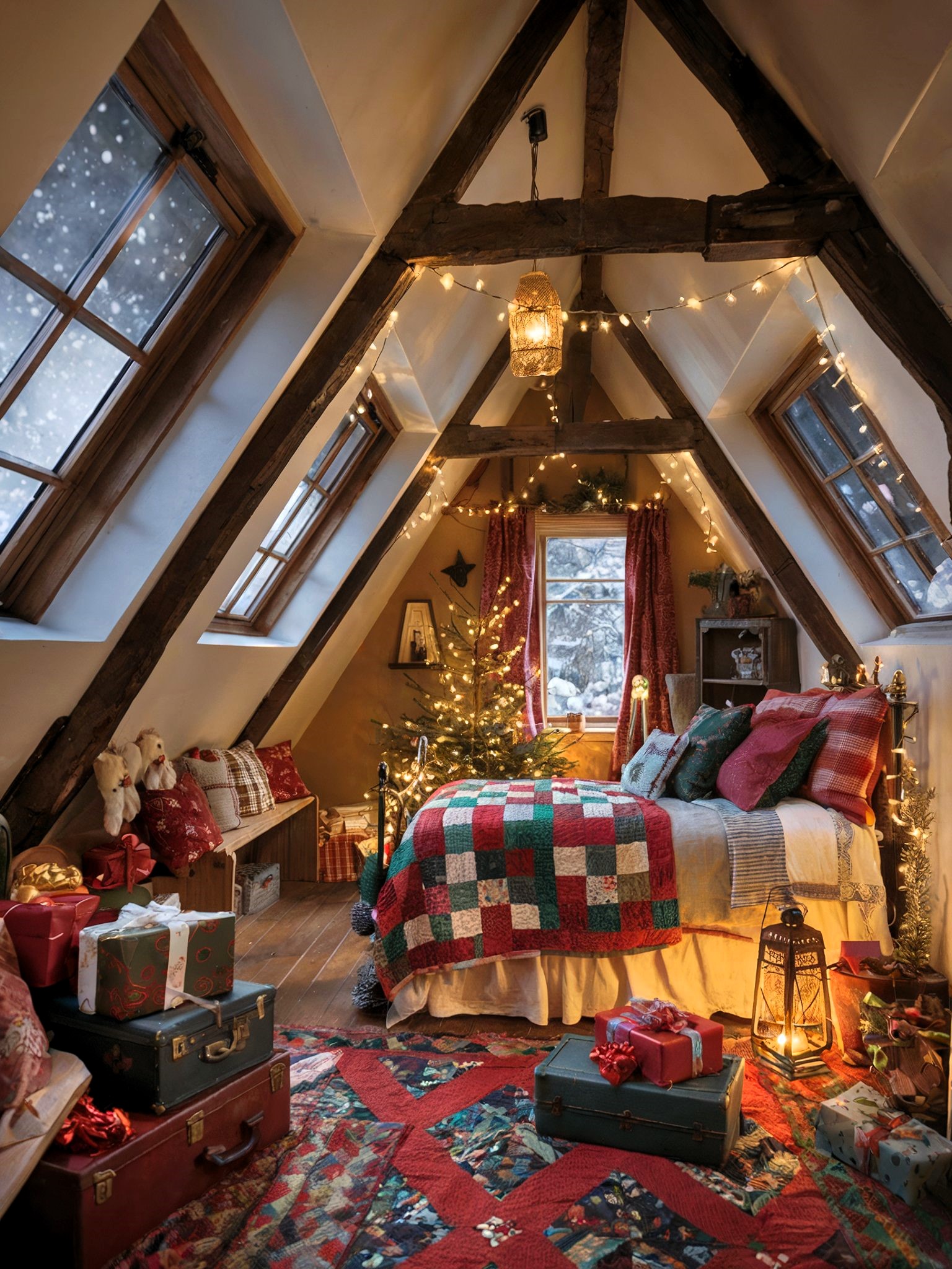 This enchanting attic bedroom masterfully combines rustic architectural elements with festive holiday charm, featuring exposed wooden beams adorned with twinkling lights, multiple skylights capturing the snowy scene outside, and a traditional patchwork quilt in rich reds and greens. The space is elevated by thoughtful vintage touches including antique trunks, a charming lantern, and a beautifully decorated Christmas tree, all working in harmony to create a cozy winter hideaway that perfectly balances whimsy with sophisticated design.