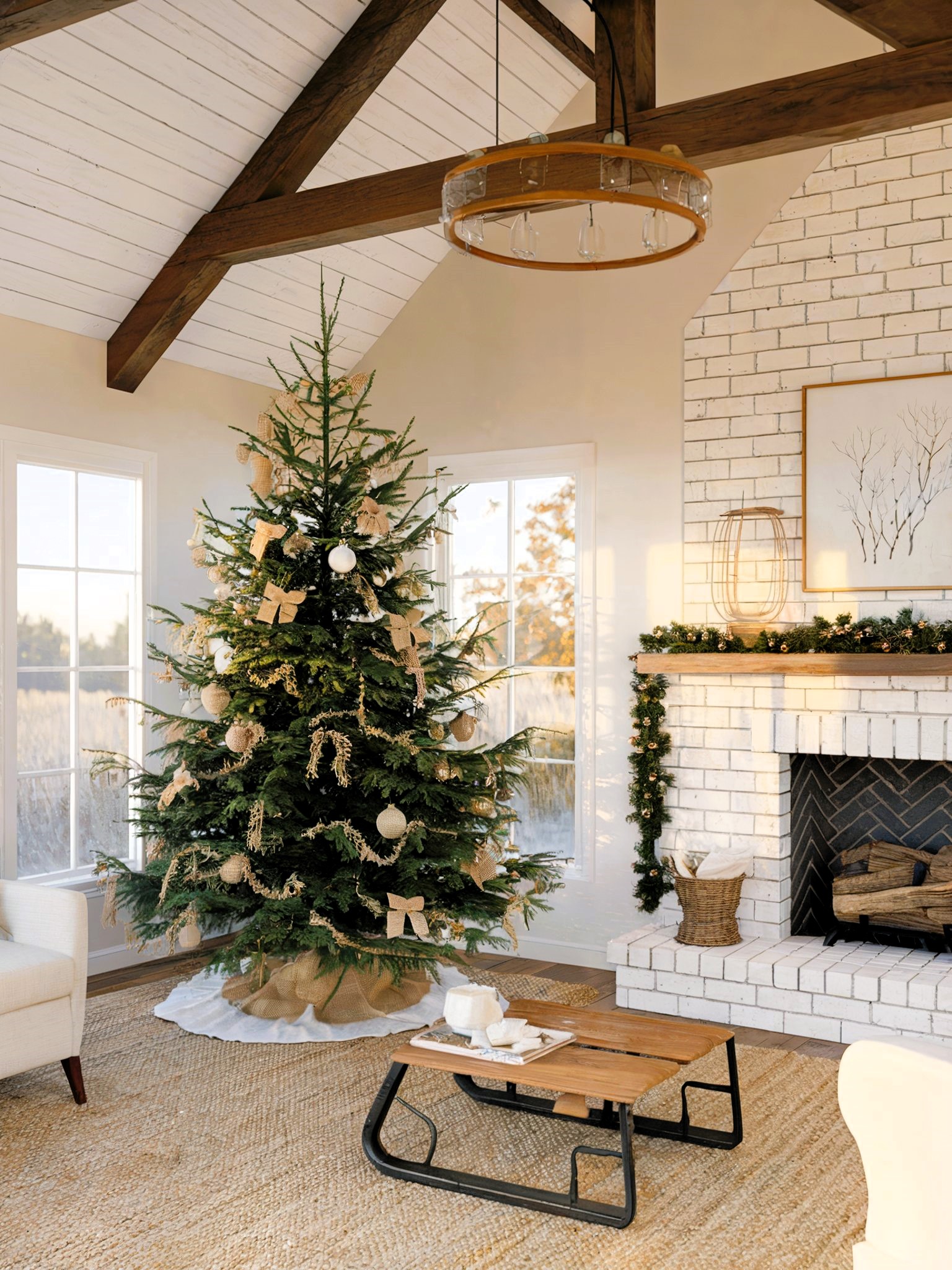 This serene modern farmhouse living room showcases a masterful blend of rustic and refined elements, featuring a soaring vaulted ceiling with exposed beams, a fresh Fraser fir adorned with neutral ornaments, and a striking white brick fireplace with herringbone inlay. The room’s cohesive neutral palette is grounded by a natural jute rug, while the architectural windows flood the space with warm late-afternoon light, creating an organic, sophisticated atmosphere that perfectly balances comfort with elegance.
