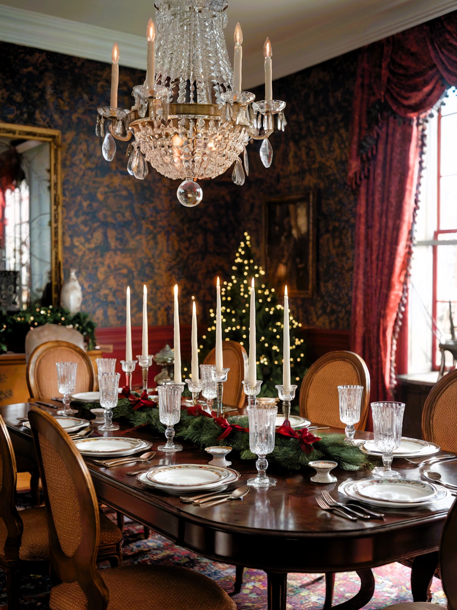 This opulent dining room exudes timeless elegance, with its rich damask wallpaper, crystal chandelier, and ornate fireplace. The formal table setting, complete with crystal glassware and silver accents, creates a sense of occasion. The centerpiece of the room is the beautifully decorated Christmas tree, which adds a touch of festive cheer to the space. The overall effect is a luxurious and inviting atmosphere, perfect for entertaining guests or enjoying a special family dinner.