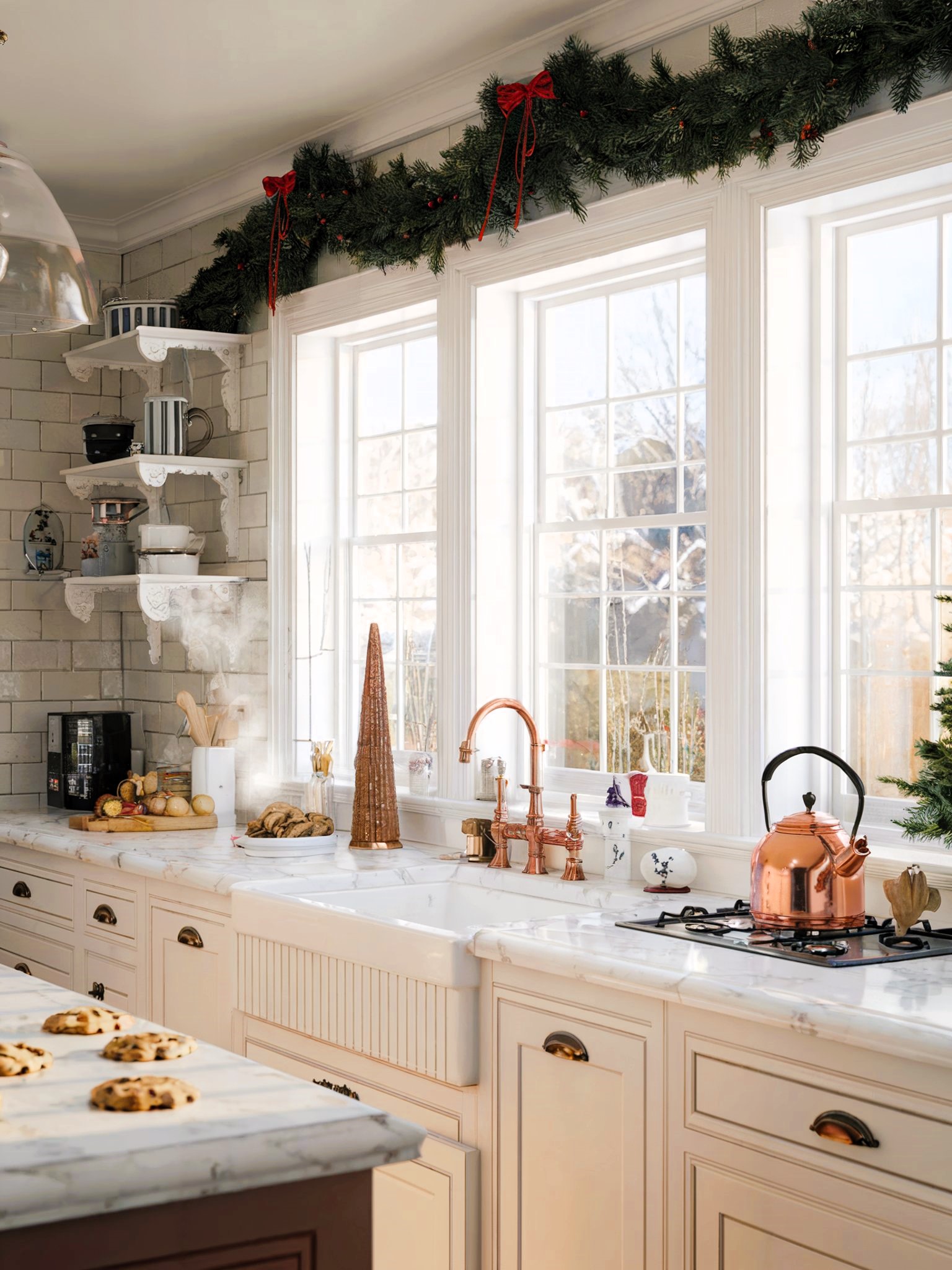 This charming kitchen exudes warmth and holiday spirit. The classic white cabinetry and subway tile backsplash create a timeless foundation, while the festive touches, like the garland adorned with red bows and the miniature Christmas trees, add a touch of cheer. The copper kettle and the aroma of freshly baked cookies create a cozy and inviting atmosphere, perfect for holiday gatherings.