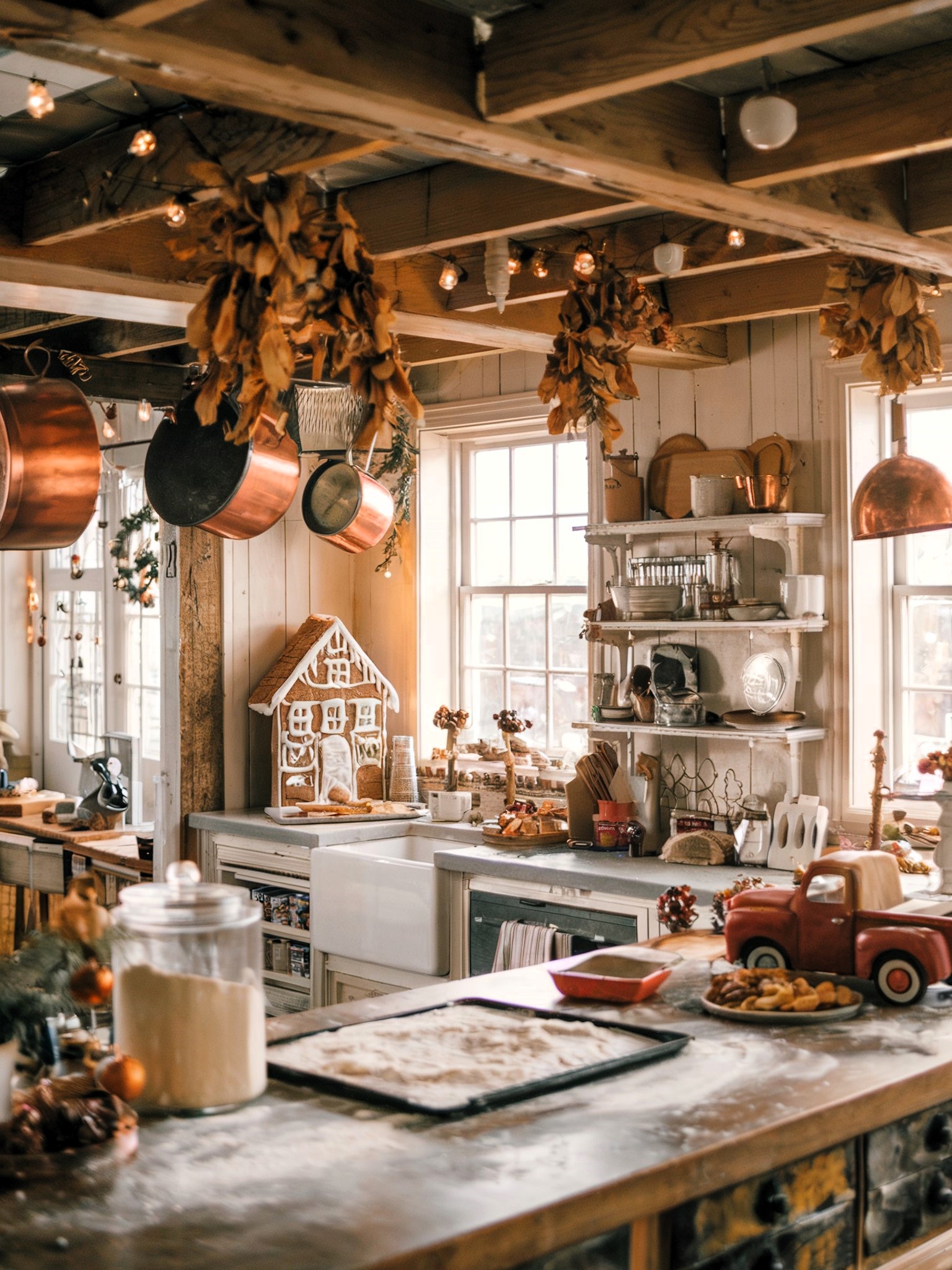 This charming rustic kitchen embodies the quintessential warmth of holiday baking with its exposed beam ceiling adorned with dried magnolia garlands and hanging copper cookware, complemented by the soft glow of vintage-style string lights casting a golden ambiance throughout. The farmhouse-style workspace, anchored by a flour-dusted wooden island and featuring an enchanting gingerbread house display, is thoughtfully arranged with open shelving that showcases a curated collection of vintage kitchenware and seasonal decorative elements, including a delightful vintage red truck that adds a nostalgic touch to the festive scene.