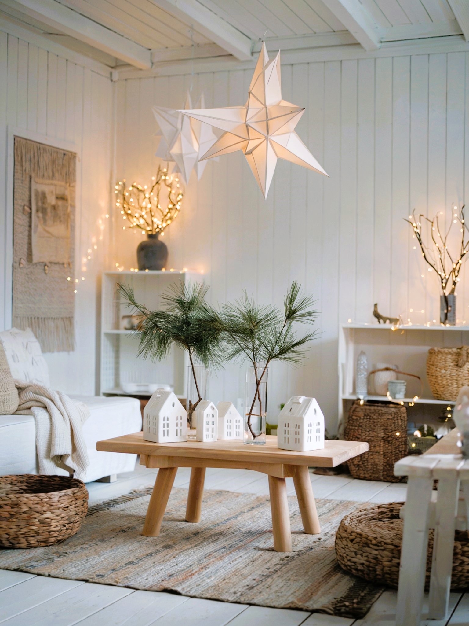 This serene living room exudes a minimalist aesthetic with a touch of holiday charm. The clean white walls and wood accents create a calming backdrop for the festive decor, including the star-shaped lanterns and miniature houses. The overall effect is a space that feels both cozy and sophisticated, perfect for relaxing and enjoying the holiday season.