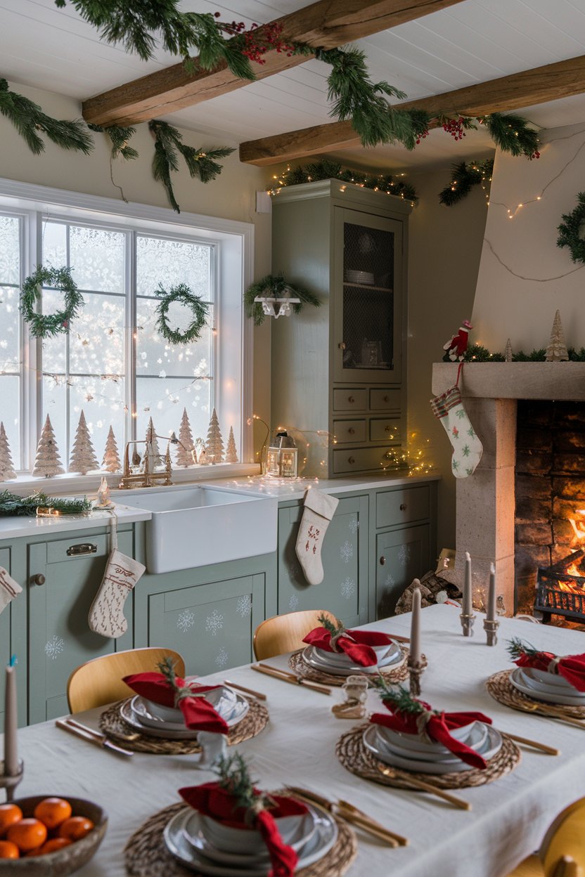 The Christmas kitchen has a warm and inviting atmosphere, with a focus on traditional elements and festive touches. The exposed wooden beams add a rustic charm, while the soft green cabinetry and white accents create a calming backdrop. The large window adorned with wreaths and snowflake decorations invites natural light, highlighting the cozy dining table set for a festive feast. The crackling fireplace and hanging stockings complete the picture of a quintessential Christmas kitchen, ready to host gatherings and create cherished memories.