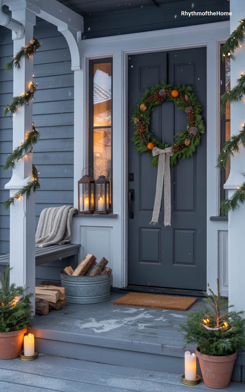 A gentle dusting of snow settles upon this inviting colonial porch, creating a picture-perfect Christmas scene. The home’s tranquil blue-grey siding provides a sophisticated backdrop for the warm, festive accents. A lush evergreen wreath, studded with natural pinecones and bright oranges, hangs on the deep charcoal door, its rustic linen bow adding a touch of organic softness. Warm fairy lights are delicately woven into a pine garland that spirals up the crisp white column, their glow echoed by the flickering candles inside two classic lanterns. A stack of firewood promises warmth within, completing this vision of a peaceful and welcoming holiday home.