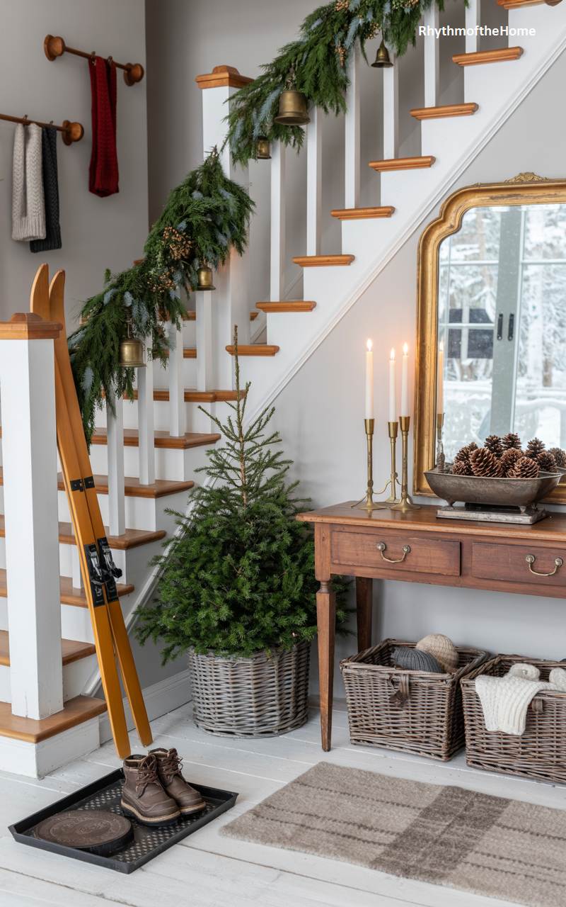 This bright and airy foyer is the epitome of rustic farmhouse charm, beautifully decorated for a cozy Christmas. A thick, verdant garland, dotted with pinecones and brass bells, cascades elegantly down the white and wood staircase, bringing the beauty of the outdoors in. At the foot of the stairs, a potted fir tree adds another layer of festive greenery. A vintage wooden console table, placed beneath a gilded mirror that reflects the winter landscape, is simply adorned with a bowl of pinecones and a trio of brass candlesticks, their lit tapers casting a warm, welcoming glow throughout the serene, white-washed space.