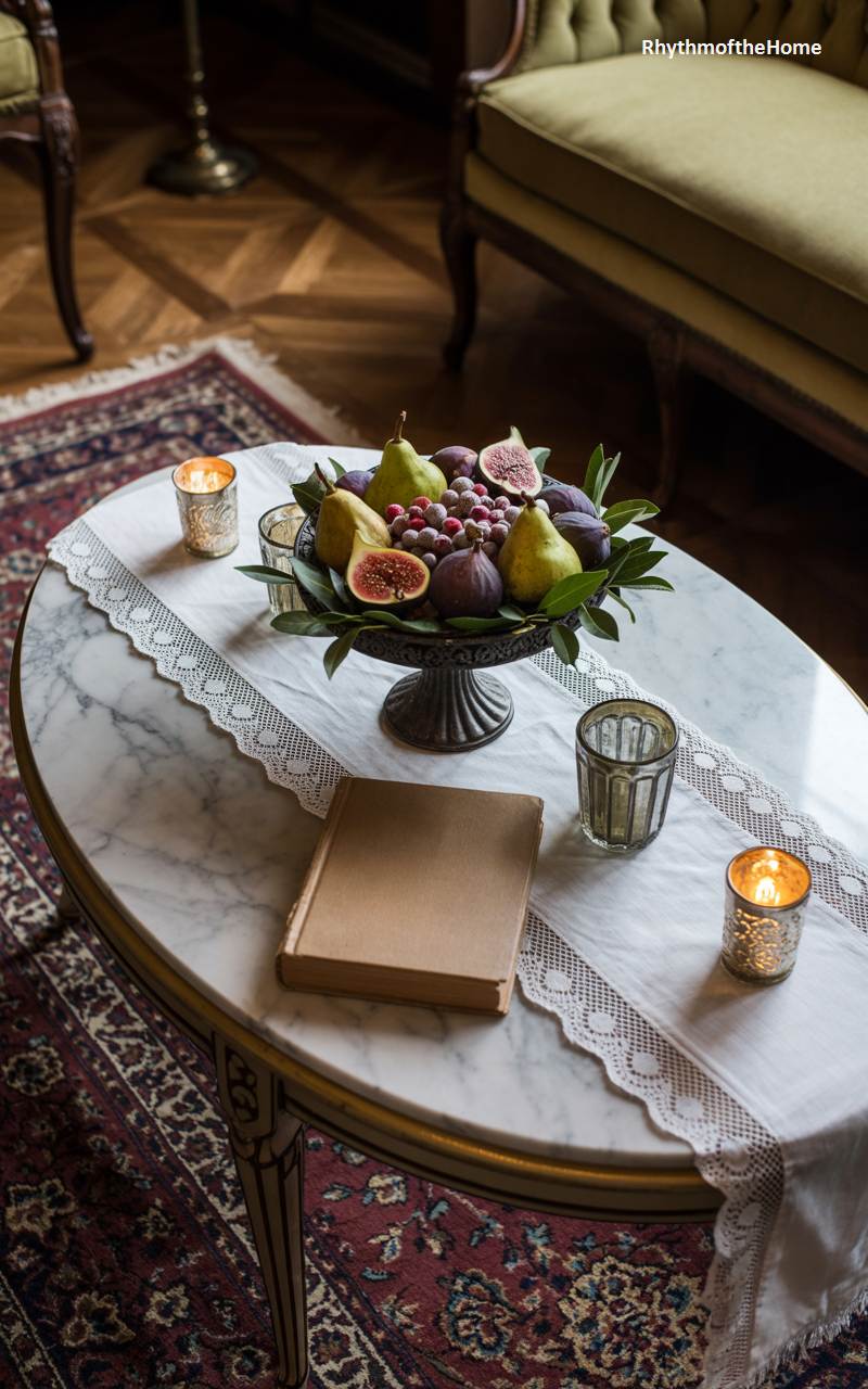 This elegant tabletop scene is reminiscent of a classic still life painting, capturing a moment of quiet, timeless beauty. An ornate marble-topped table is set with a simple white lace runner. A dark, footed bowl is filled with a bountiful arrangement of fresh figs, pears, and lush green leaves, a symbol of holiday abundance. Two sparkling glasses and flickering candles in mercury glass holders add a touch of warmth and intimacy. A simple, cloth-bound book lies ready to be read. This is not a scene of grand decoration, but of the quiet, beautiful moments that make the Christmas season so special.