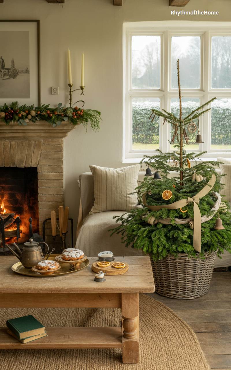 Stepping into this room feels like embracing the warm heart of an English cottage Christmas. A rustic, sparsely branched Christmas tree, nestled in a wicker basket, is adorned with simple, natural ornaments like dried orange slices and bells. A fire crackles cheerfully in the stone fireplace, its mantelpiece decorated with a lovely garland of greenery and berries. On the rough-hewn wooden coffee table, a silver teapot and freshly baked cakes await, promising a delightful afternoon treat. This scene is a perfect blend of rustic simplicity, cozy comfort, and the timeless traditions of the holiday season.
