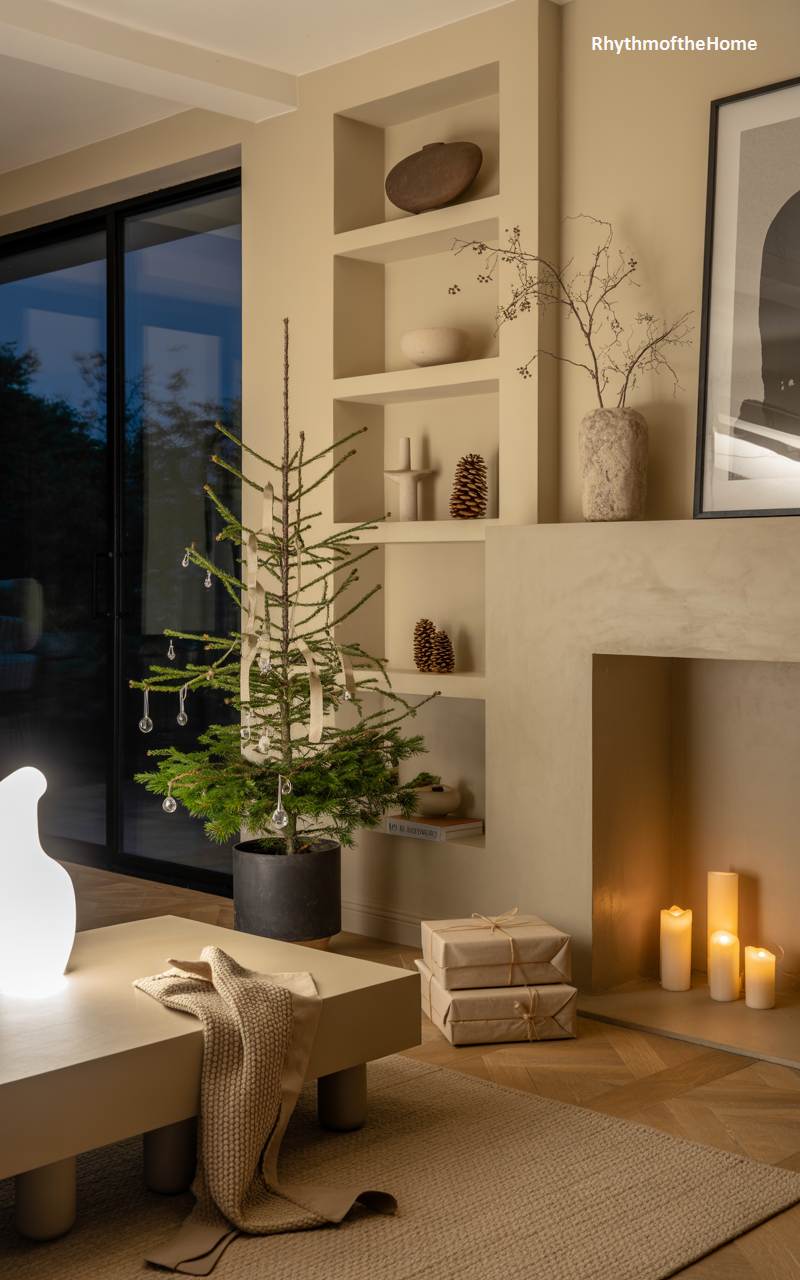 This living room showcases a serene and contemporary approach to Christmas decor, where simplicity and texture reign. A sparse, natural Christmas tree in a simple black pot is decorated with delicate glass teardrops and a white ribbon, its organic shape a focal point against the clean, neutral walls. The minimalist fireplace and built-in shelving are adorned with just a few carefully chosen objects: pinecones, bare branches in a vase, and simple ceramic forms. A cluster of white pillar candles provides a soft, ambient glow, enhancing the tranquil and sophisticated atmosphere of this modern holiday sanctuary.