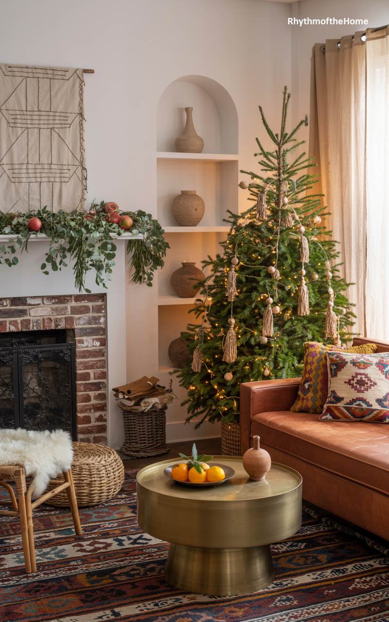 Warm, earthy tones and a wealth of textures create a welcoming, bohemian-inspired Christmas atmosphere in this living room. A full, natural Christmas tree is aglow with fairy lights and decorated with charming tassels and simple ornaments, complementing the rich patterns of the Persian-style rug. A lush garland of eucalyptus and other greens, accented with pomegranates and apples, drapes artfully across the fireplace mantel. A supple leather sofa, layered with patterned pillows, and a brass coffee table topped with a bowl of fresh oranges complete this eclectic, cozy, and effortlessly stylish holiday scene.