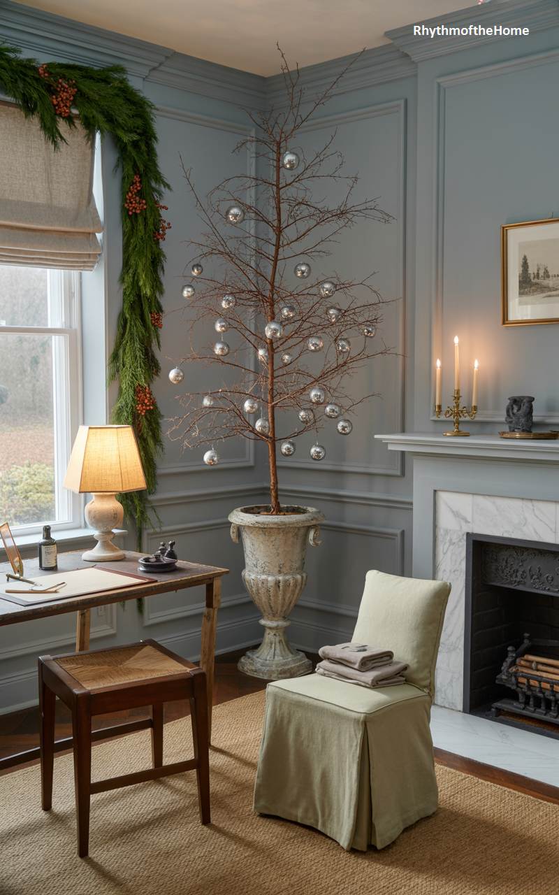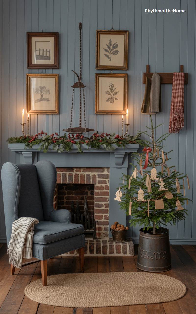 This room exudes a sense of quiet history and traditional Christmas charm, reminiscent of a colonial-era home. The serene, blue-grey paneled walls provide a sophisticated backdrop for the simple yet elegant holiday decorations. A rustic Christmas tree, housed in an antique metal container, is adorned with charming, handcrafted wooden ornaments. The fireplace mantel is draped with a garland of greenery and red berries, flanked by two lit taper candles in classic holders. A comfortable wingback chair, draped with a plaid throw, invites one to sit by the fire and enjoy a peaceful moment in this timelessly beautiful setting.