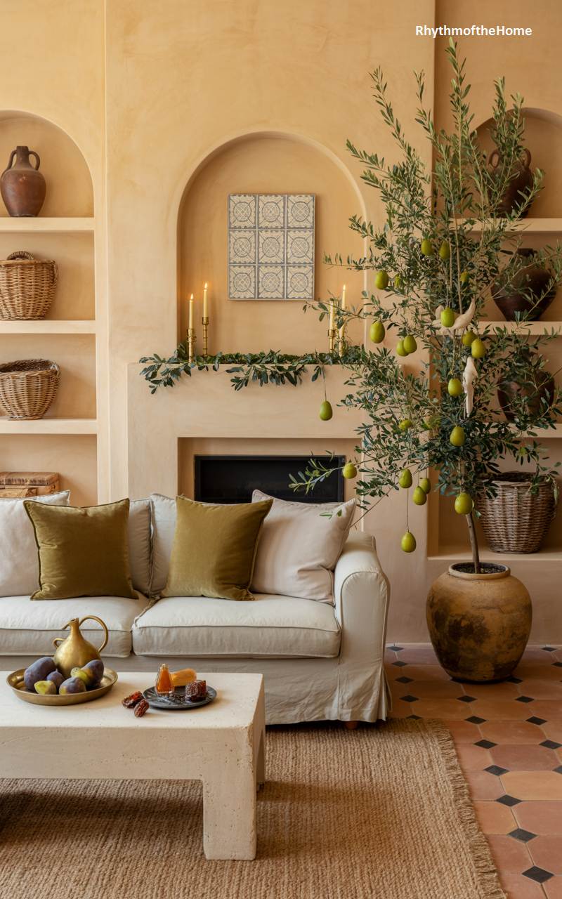 This serene living space offers a unique and beautiful take on Christmas, inspired by the sun-drenched Mediterranean. Instead of a traditional fir, a potted olive tree is decorated with delicate, olive-shaped ornaments, its silvery-green leaves shimmering in the warm light. The room’s earthy, plaster-like walls and terracotta tile floors create a tranquil and organic backdrop. The minimalist fireplace mantel is draped with a simple olive branch garland and accented with flickering candles. A comfortable off-white sofa with olive-green velvet cushions invites relaxation in this peaceful, nature-inspired holiday sanctuary that feels both fresh and timeless.