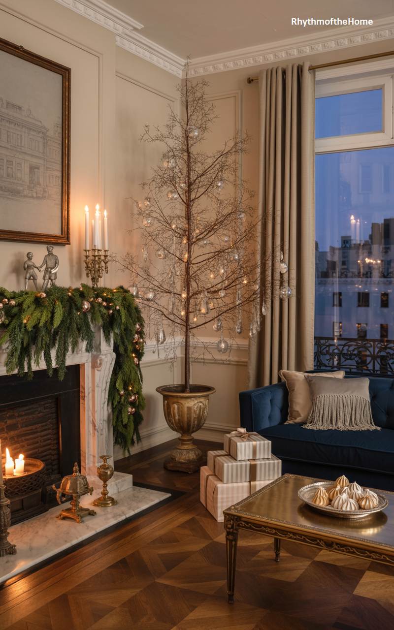 This sophisticated Parisian apartment celebrates Christmas with classic elegance and a touch of glamour. In place of a traditional evergreen, a striking leafless tree stands in a grand urn, its bare branches delicately adorned with shimmering glass baubles. A lush fir garland, woven with pink and gold ornaments, cascades gracefully over the marble fireplace mantel. A luxurious blue velvet sofa and a gleaming gold coffee table, set with a platter of meringues, add to the room’s refined opulence. The view of the city lights from the large window completes this magical and chic holiday scene.