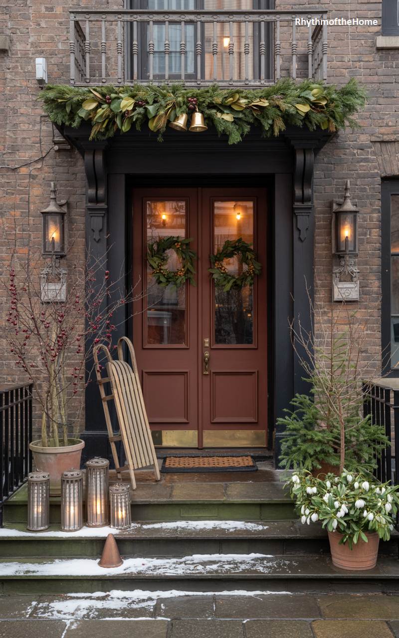 The stately entrance of this classic brick townhouse is dressed in its Christmas finest, exuding timeless urban charm. A magnificent garland, rich with magnolia leaves and evergreen boughs and centered with three gleaming brass bells, creates a grand statement above the entryway. Matching evergreen wreaths adorn the warm, mahogany-toned double doors, offering a symmetrical and welcoming gesture. Wrought-iron wall lanterns cast an ambient glow, highlighting a vintage wooden sled that leans casually beside the door. Potted arrangements of winterberry add a festive pop of red, while a touch of snow on the stone steps whispers of the season’s magic.