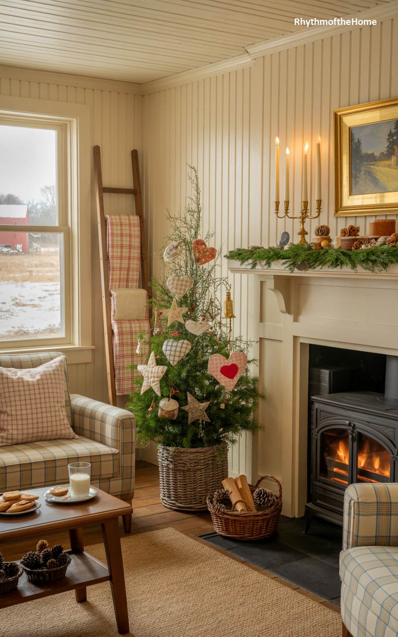 This charming room is brimming with the sweet, nostalgic spirit of a country Christmas. The centerpiece is a delightful fir tree in a wicker basket, lovingly decorated with handmade fabric hearts and star ornaments. A fire burns brightly in a classic wood stove, while the simple white mantelpiece above is adorned with a fresh garland and a trio of tall, elegant taper candles. A cozy armchair, upholstered in a cheerful plaid fabric, sits beside the hearth, perfect for enjoying a glass of milk and cookies. This space feels warm, heartfelt, and filled with the simple joys of the holiday season.