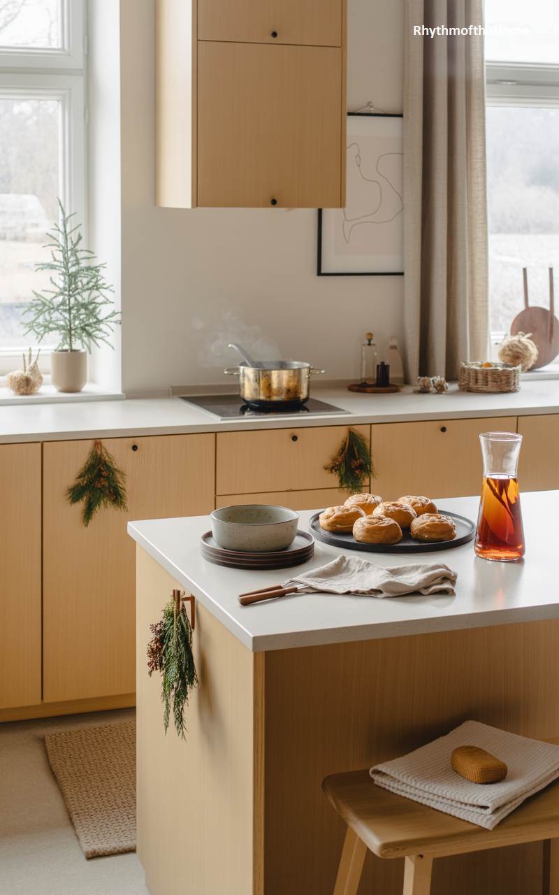 This modern Scandinavian kitchen is a picture of minimalist holiday charm and warmth. The light wood cabinetry and white countertops create a clean and airy backdrop for subtle festive touches. Small sprigs of evergreen and red berries are tucked into the cabinet handles, adding a simple and natural pop of Christmas color. A small potted pine tree sits on the countertop, bringing a touch of the outdoors in. A pot steams gently on the stove, suggesting a warm holiday drink is being prepared, while a platter of freshly baked buns awaits on the island, filling the space with an air of cozy hospitality.
