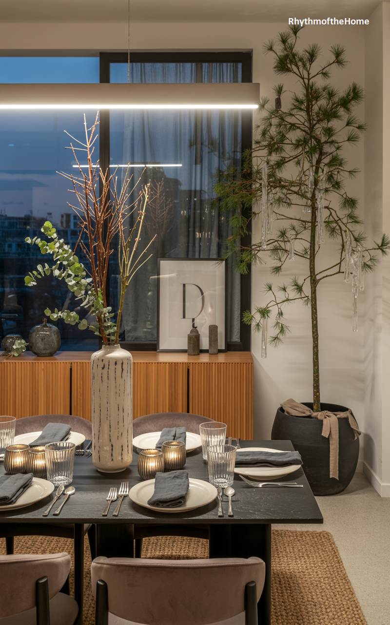 Sleek, sophisticated, and imbued with a moody elegance, this dining room offers a contemporary take on Christmas festivities. The dark dining table is set with minimalist white plates and grey linen napkins, creating a striking contrast. A tall, sparse pine tree in a black pot is decorated with delicate glass icicles, its natural form adding a touch of organic beauty to the modern space. A dramatic linear suspension light illuminates the scene, while a large window reveals the city skyline at dusk. A simple arrangement of eucalyptus and bare branches in a textured vase adds a final, artful touch.