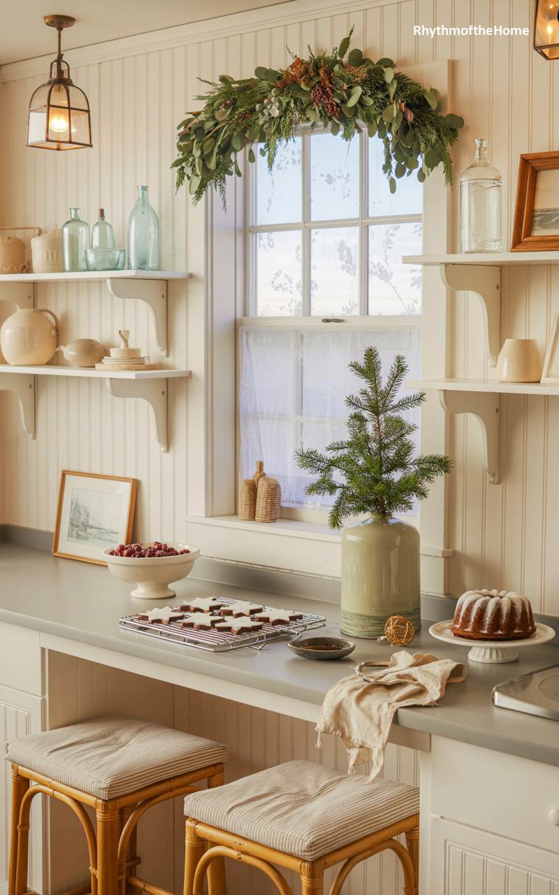 This charming kitchen nook is a sweet and serene vision of a coastal Christmas. The white shiplap walls and soft grey countertops create a bright and airy backdrop, reminiscent of a seaside cottage. A small fir tree in a rustic ceramic vase sits on the counter, its simplicity perfectly in tune with the room’s relaxed vibe. A garland of eucalyptus drapes gracefully above the window. Freshly baked star-shaped cookies cool on a wire rack, and a delicious-looking bundt cake sits on a pedestal, filling the air with the irresistible scent of holiday baking and creating a scene of cozy, homespun cheer.
