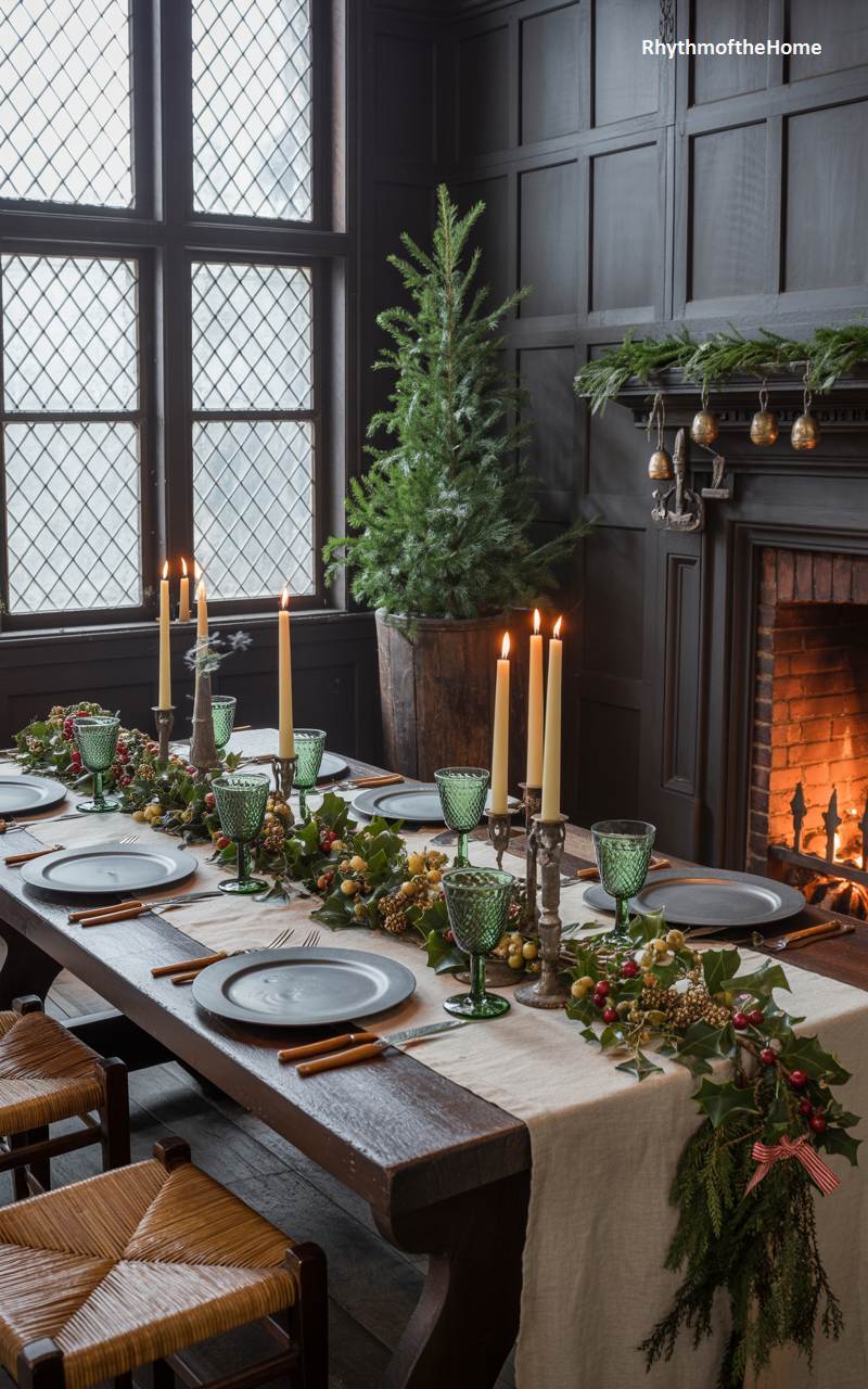 Steeped in history and dramatic elegance, this dining room is set for a magnificent Christmas feast reminiscent of a grand Tudor hall. The dark, wood-paneled walls and leaded glass windows create a rich and moody atmosphere. A long, heavy wooden table is set with dark pewter plates and vibrant green glassware, illuminated by the warm glow of numerous taper candles in antique silver holders. A lush garland of holly and berries runs the length of the table, and a tall evergreen tree stands by the hearth, where a fire roars, casting flickering shadows and completing this timeless and majestic holiday scene.