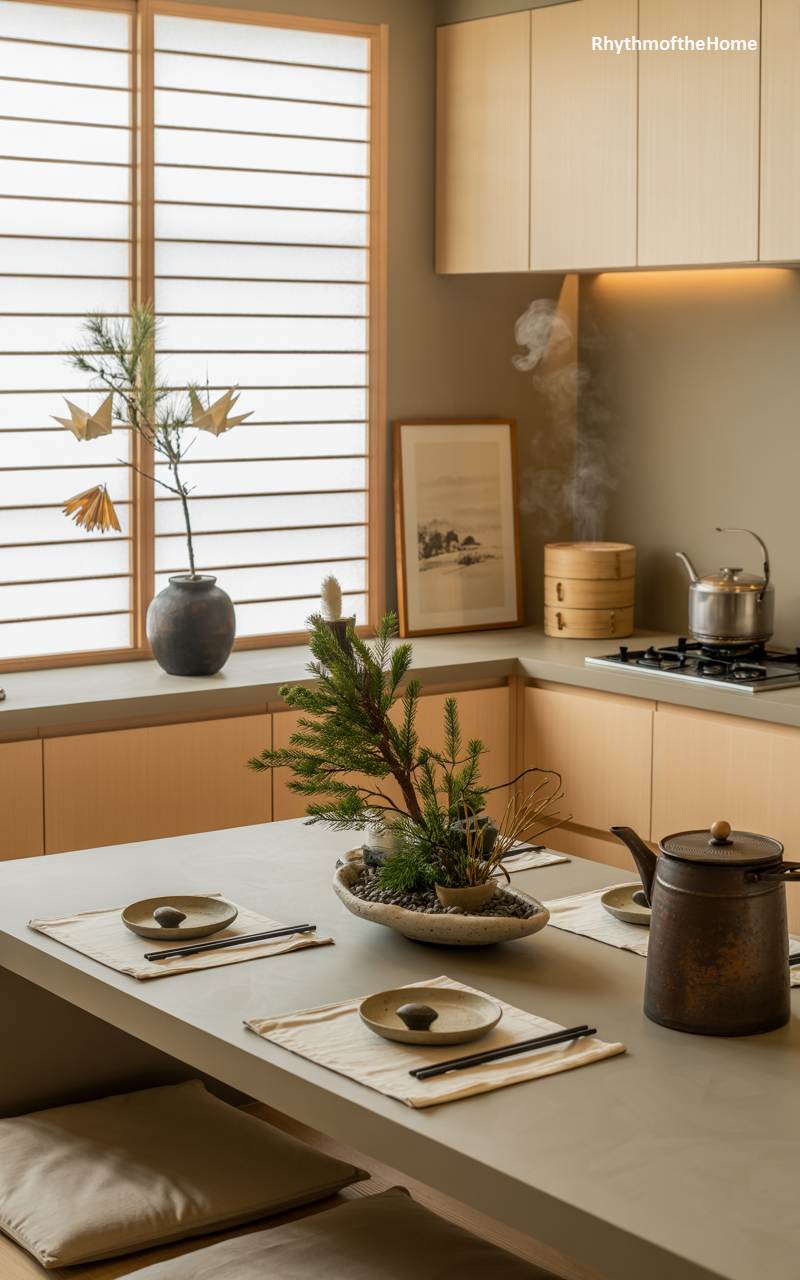 This dining space embodies a peaceful and minimalist aesthetic, beautifully blending Japanese design with subtle holiday elements. The low table is set for an intimate meal with simple ceramic plates, chopsticks, and linen placemats. A unique centerpiece, an ikebana-style arrangement of pine branches and other natural elements, serves as a contemplative focal point. In the corner, a small pine branch in a rustic vase is decorated with delicate origami cranes. The gentle steam rising from a kettle on the stove and the soft light filtering through the shoji screens create a tranquil and restorative atmosphere for a mindful Christmas gathering.