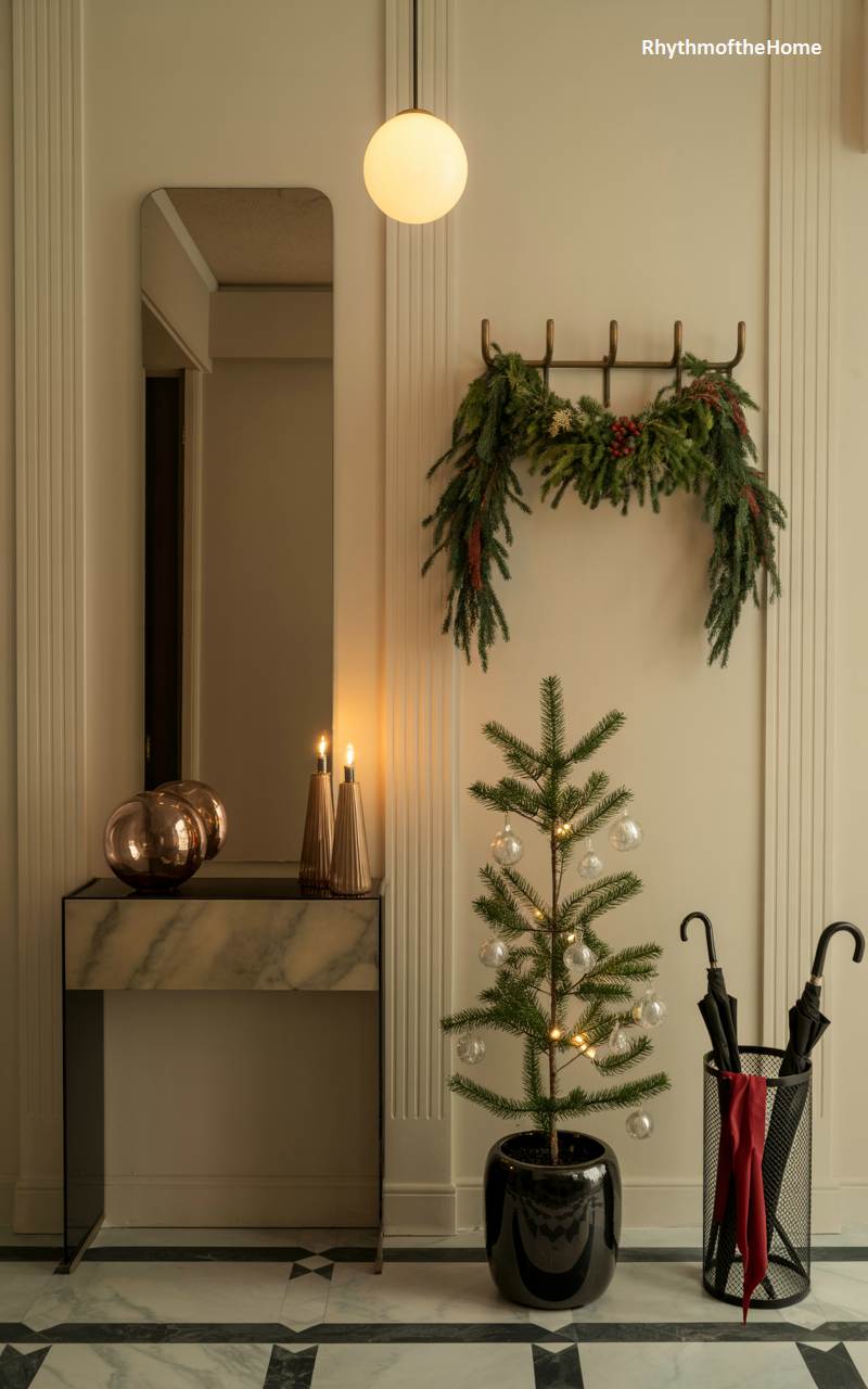 In this impeccably chic entryway, Christmas is celebrated with minimalist grace and modern sophistication. Set against pristine white paneled walls, a sleek marble console table displays a curated collection of copper orbs and flickering candles, their warm light softly reflected in the tall, frameless mirror. A simple garland of fresh fir and red berries drapes elegantly over a wooden coat rack, infusing the space with a natural, festive scent. The star of the scene is a sparsely adorned Christmas tree in a glossy black pot, its delicate glass baubles catching the light and proving that holiday spirit can be both understated and beautiful.