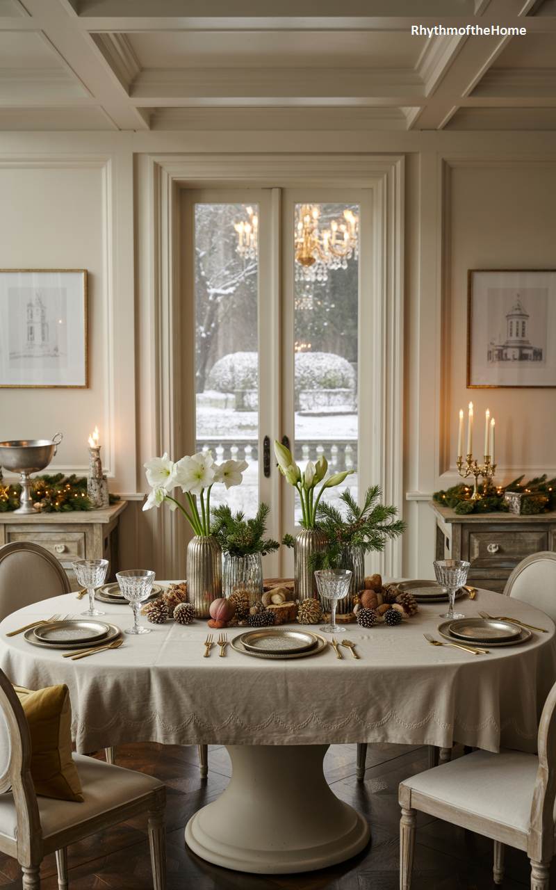 This elegant dining room is the picture of classic Christmas refinement and grace. A beautifully set round table, draped in a cream-colored linen cloth, awaits guests. The place settings are timeless, with gold-rimmed plates and sparkling crystal glasses. A centerpiece of pinecones, nuts, and fresh amaryllis flowers adds natural beauty and sophistication. In the background, two sideboards are adorned with festive lights and candles, and through the grand French doors, a snowy garden scene is visible, adding a touch of winter wonderland magic to this impeccably styled and inviting holiday setting.