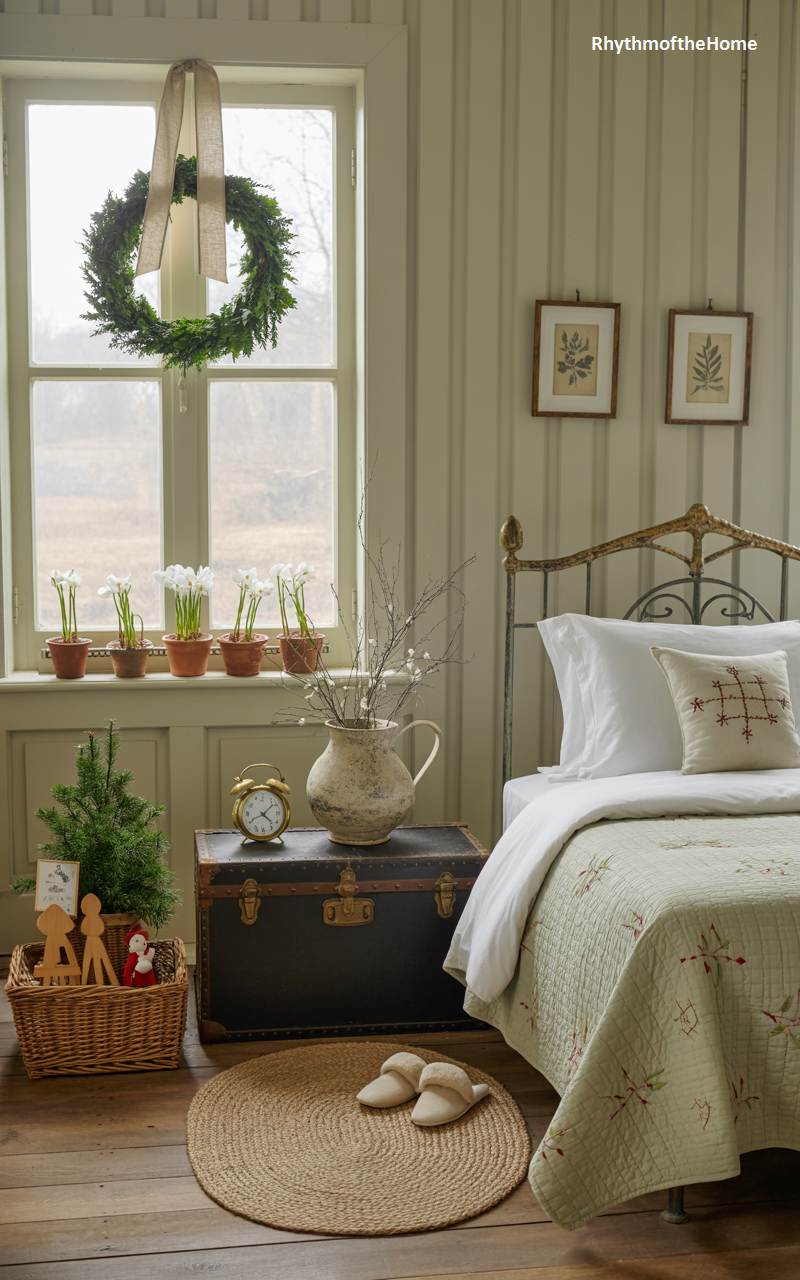 This charming bedroom is filled with the simple, rustic beauty of a country cottage Christmas. A fresh boxwood wreath, tied with a simple linen ribbon, hangs in the multi-paned window, framing a view of the quiet winter landscape. A small fir tree in a basket sits beside a vintage trunk, which serves as a unique nightstand. On the sill, a row of potted paperwhites is just beginning to bloom, a hopeful sign of spring amidst the winter festivities. The iron bed is dressed in a lovely quilted coverlet, making this room a peaceful and nostalgic retreat for the holiday season.