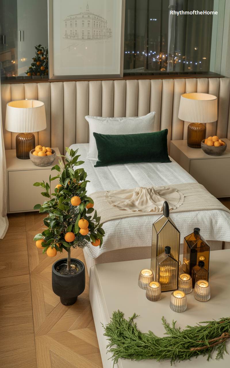 This contemporary bedroom blends modern luxury with festive holiday cheer. At the foot of the bed, a potted tangerine tree, laden with bright orange fruit, serves as a unique and vibrant Christmas tree. The upholstered headboard and soft, neutral bedding create a sophisticated and comfortable backdrop. A collection of elegant glass lanterns with lit candles on the bench adds a touch of glamour and warmth, their faceted surfaces reflecting the light beautifully. The overall effect is one of chic, understated elegance, with a fresh and festive twist on traditional holiday decor.