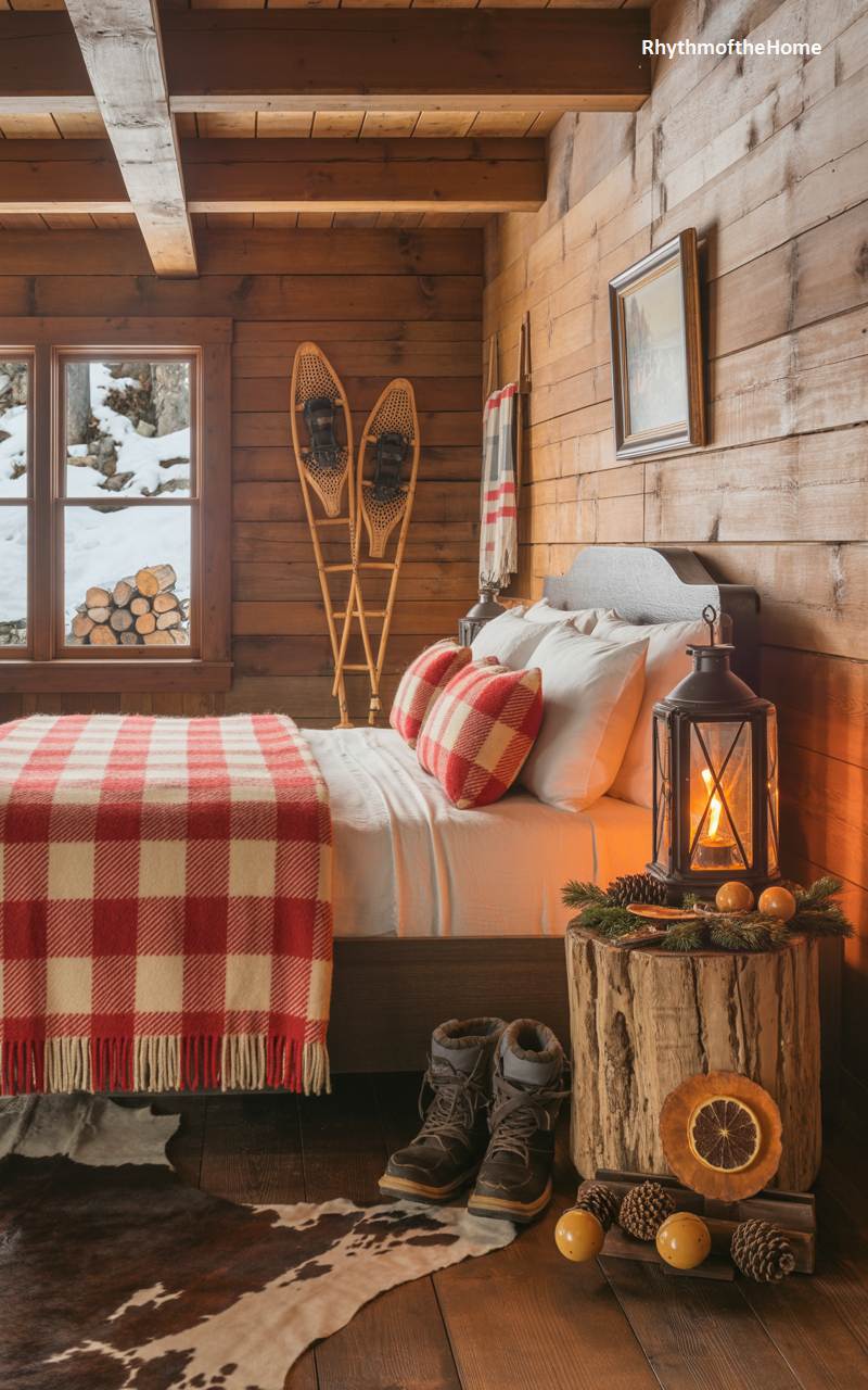 Nestled within rustic wood-paneled walls, this cozy bedroom is the perfect Christmas retreat in a mountain cabin. A classic red and white plaid wool blanket adds a bold, festive touch to the comfortable bed. A pair of vintage snowshoes hangs on the wall, hinting at outdoor adventures in the snowy landscape visible through the window. For a nightstand, a simple tree stump holds a rustic lantern, its flickering candle casting a warm and inviting glow. A small arrangement of pine branches, dried orange slices, and pinecones adds a natural, fragrant element, completing this quintessential cozy cabin Christmas scene.
