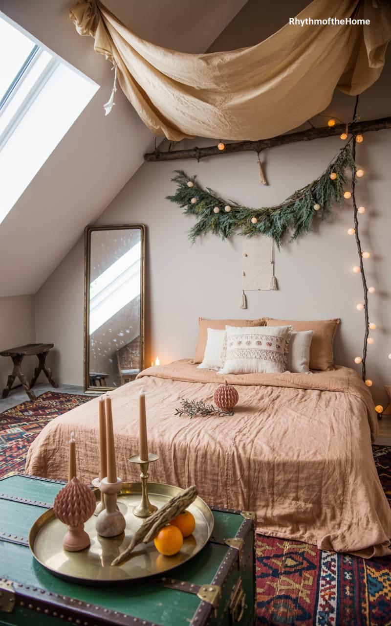 This attic bedroom is a cozy, bohemian dream, draped in warmth and eclectic charm for Christmas. A canopy of soft, sandy-colored fabric creates an intimate, tent-like feel over the bed, which is dressed in earthy terracotta linens. A lush evergreen garland, strung with fairy lights, hangs on the wall, adding a touch of festive magic. A vintage green trunk at the foot of the bed serves as a unique coffee table, holding a brass tray with candles and fresh oranges. The mix of textures, warm lighting, and natural elements makes this a truly enchanting and unconventional holiday retreat.