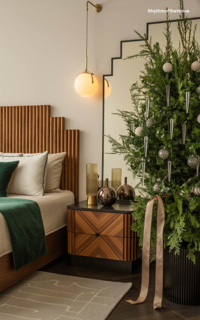 This stylish bedroom seamlessly integrates sophisticated mid-century modern design with elegant Christmas decor. A tall, slender cedar tree, decorated with shimmering silver and icicle ornaments, adds a festive vertical element to the room. The stunning wooden headboard with its fluted design is a work of art in itself. The bedside table, featuring a beautiful chevron wood grain, holds a contemporary lamp and reflective vases that complement the tree’s ornaments. The rich green velvet throw and pillows add a touch of holiday color and luxurious texture, creating a chic and restful holiday ambiance.