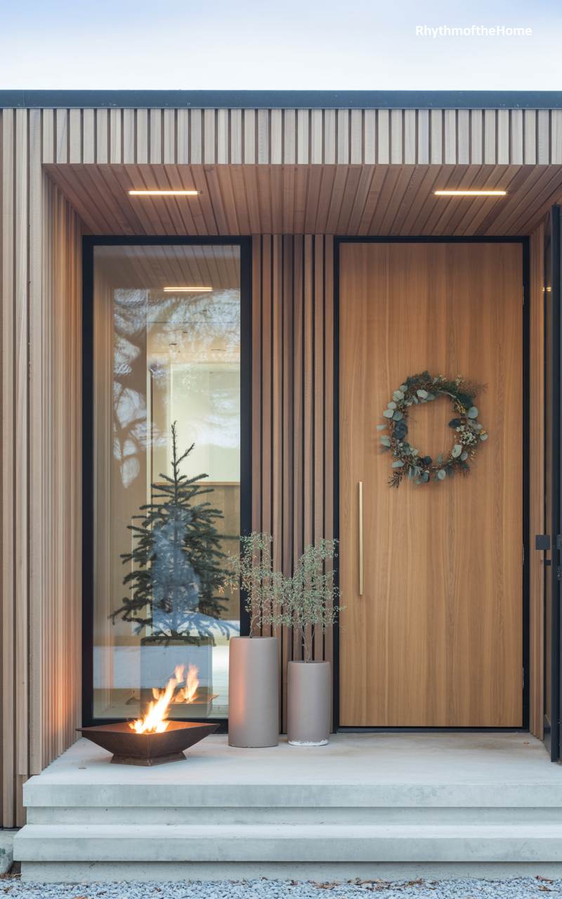 This contemporary home embraces the Christmas season with warmth and architectural elegance. The facade of vertical wood slats provides a stunningly textured canvas for the minimalist holiday decor. A simple, airy wreath of eucalyptus and dried botanicals hangs on the flush wooden door, its organic form a beautiful contrast to the clean lines of the home. Beside the entrance, a striking fire bowl crackles merrily, its living flames casting a dancing, warm glow on the concrete steps and modern planters. The reflection of a Christmas tree inside, seen through the large glass panel, seamlessly blends the indoor festivities with the serene outdoor ambiance.