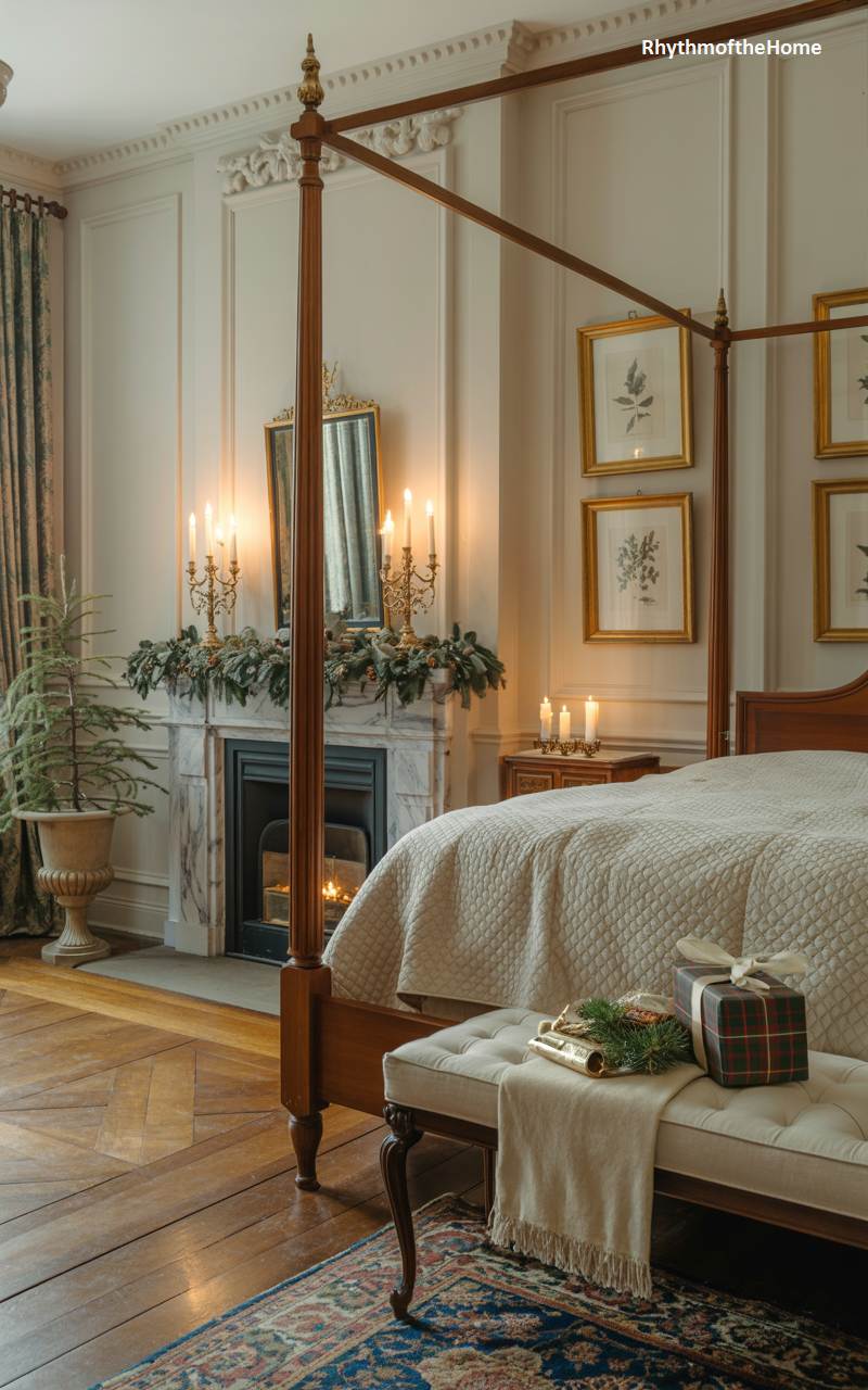 This magnificent bedroom exudes timeless elegance, decorated for a classic and grand Christmas. A stately four-poster bed is the centerpiece, with a tufted bench at its foot holding a beautifully wrapped gift. A roaring fire in the marble fireplace adds warmth and ambiance, its mantel draped in a lush garland of greenery and illuminated by multiple candelabras. A small, natural fir tree stands in a classic urn in the corner. Framed botanical prints on the wall and a rich antique rug complete this sophisticated and luxurious holiday sanctuary, fit for a peaceful Christmas morning.