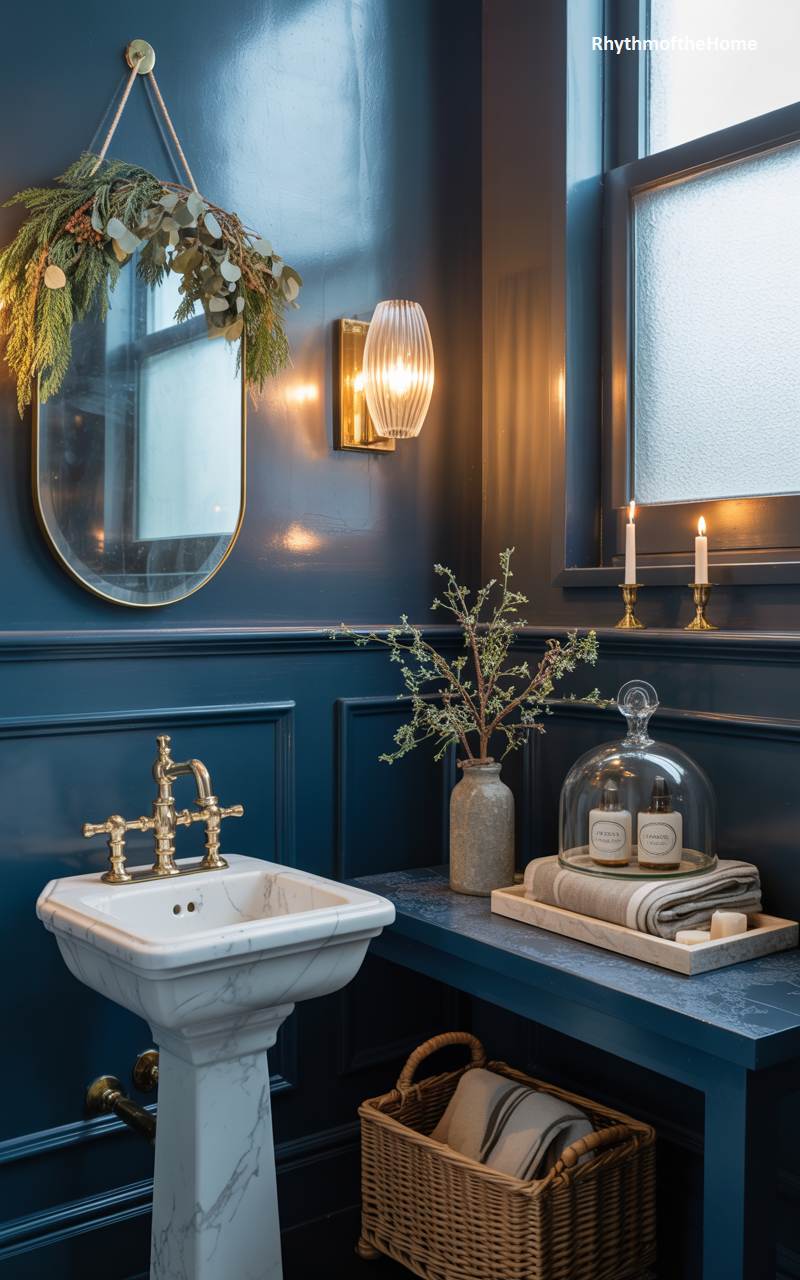 This jewel-box powder room is a stunning example of how to bring festive cheer to even the smallest of spaces. The deep, glossy navy-blue walls create a dramatic and sophisticated backdrop for the holiday decor. A simple but elegant wreath of eucalyptus and cedar, woven with a string of warm lights, hangs on the oval mirror, adding a touch of organic beauty. The brass fixtures and sconce gleam in the candlelight from two slender tapers on the counter. This small space proves that a few well-chosen elements can create a powerful and stylish Christmas statement.