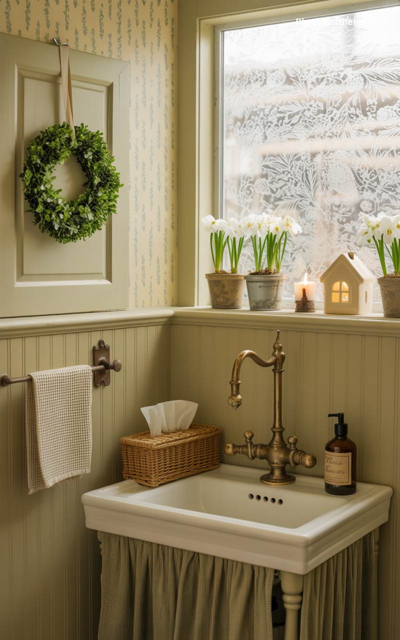 This sweet and charming bathroom is filled with the cozy, rustic feeling of a country cottage at Christmas. The soft green beadboard walls and vintage-style sink with a ruffled skirt create a nostalgic and welcoming atmosphere. A simple, fresh boxwood wreath hangs on the cabinet door, adding a perfect touch of holiday greenery. On the windowsill, potted paperwhites bloom beside a quaint ceramic house lantern, its tiny light glowing warmly. The frosted window pane, with its delicate, winty pattern, adds another layer of seasonal charm to this delightful and festive little space.