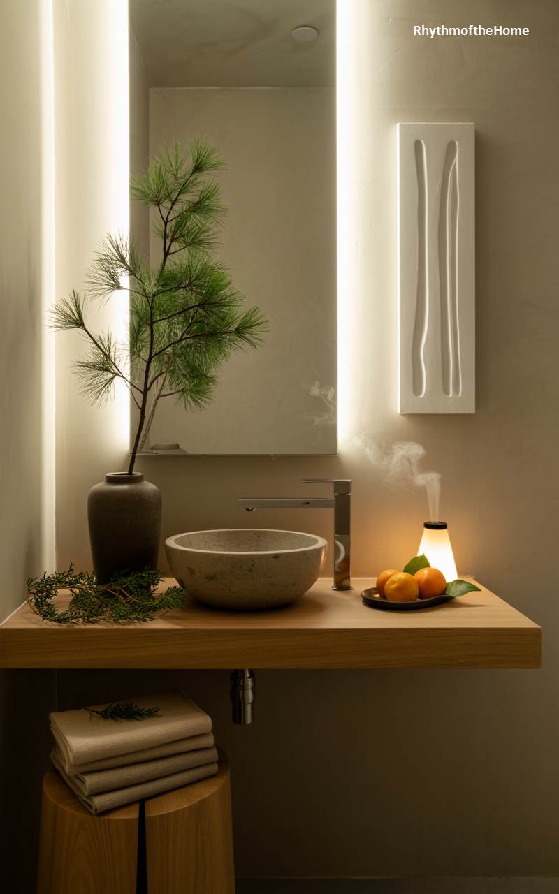This bathroom is transformed into a serene, spa-like retreat with minimalist and natural Christmas decorations. The clean lines of the floating wood vanity and stone vessel sink create a tranquil, organic foundation. A single, elegant branch of pine in a dark ceramic vase brings a touch of nature indoors, its form reflected in the sleek mirror. A small diffuser emits a gentle stream of scented vapor, likely filling the air with a calming holiday fragrance like pine or frankincense. A small dish of clementines adds a pop of color and a hint of festive scent, completing this peaceful, modern holiday oasis.