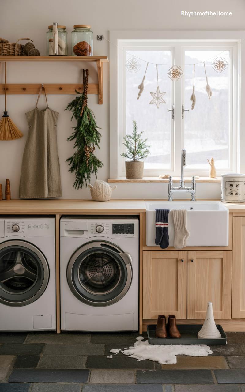 Even the laundry room is imbued with the cozy and practical charm of a rustic farmhouse Christmas. The space is bright and functional, with light wood countertops and a classic apron-front sink. Holiday cheer is added through simple, natural touches: a hanging bunch of evergreen and berries, a small potted tree on the windowsill, and charming straw star ornaments dangling in the window. A pair of wooly socks hangs to dry, while a tray on the floor with melted snow and boots tells a story of coming in from the winter cold. This room proves that festive spirit can be found in every corner of the home.