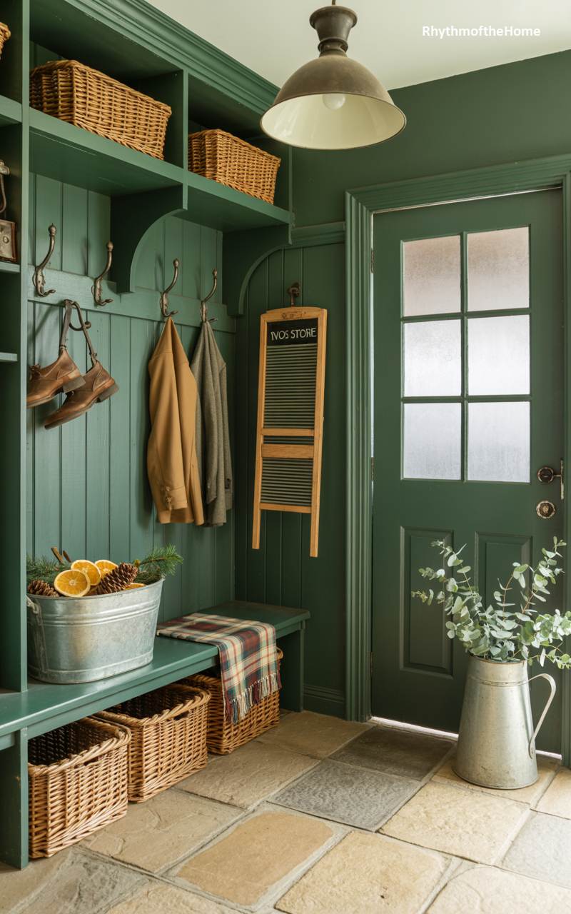 This beautifully organized mudroom, painted a deep and dramatic forest green, is both highly functional and wonderfully festive. The built-in bench and coat hooks provide ample storage, while wicker baskets add natural texture. For Christmas, a galvanized metal bucket on the bench is filled with fresh pine boughs, pinecones, and bright slices of dried orange, creating a beautiful and fragrant holiday arrangement. A plaid blanket adds a touch of cozy pattern and warmth. This space is a perfect example of a welcoming and stylish country entrance, ready for the holiday season.