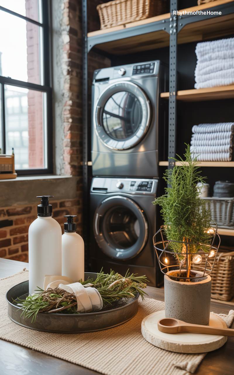 This stylish laundry area, located in an urban loft, cleverly incorporates festive decor without sacrificing its modern, industrial aesthetic. The stacked washer and dryer unit in a sleek charcoal finish is framed by exposed brick and open shelving. A small rosemary tree in a concrete pot, strung with delicate fairy lights, sits on a nearby table, adding a touch of green and a wonderful holiday scent. A metal tray holds a bundle of fresh rosemary tied with a simple ribbon, alongside minimalist soap dispensers. This scene demonstrates how to bring a touch of Christmas to a practical space in a chic and understated way.