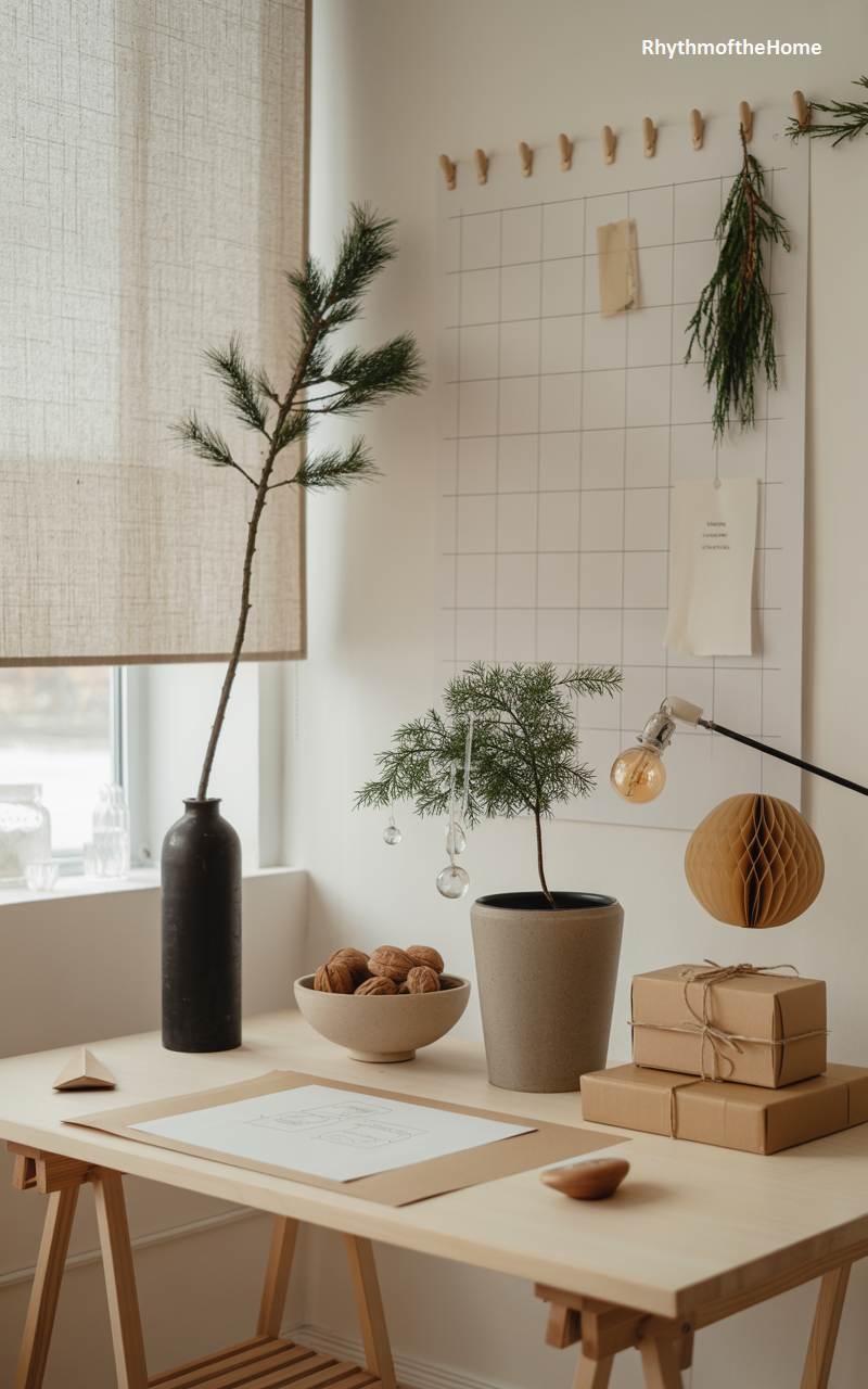 This bright and airy workspace celebrates Christmas with a creative and minimalist touch. The simple wooden desk is arranged with understated holiday elements: a small potted evergreen with delicate glass ornaments, a bowl of walnuts, and neatly wrapped gifts in brown paper. A single pine branch stands elegantly in a tall, dark vase, its graphic silhouette adding a touch of natural drama. A wire grid on the wall serves as a mood board, adorned with a sprig of greenery and simple notes. The overall aesthetic is calm, inspired, and perfectly suited for a creative mind during the holiday season.