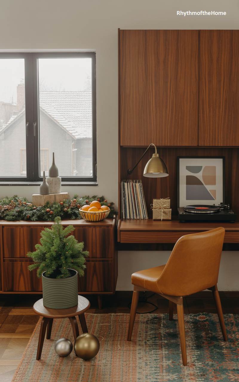 This home office is a stunning tribute to mid-century modern design, with holiday decorations that perfectly complement the aesthetic. The rich walnut wood of the desk and credenza provides a warm and stylish foundation. A small, vibrant green Christmas tree in a simple pot sits on a three-legged stool, while a garland of fresh greenery and berries adorns the credenza. A vintage turntable is ready to play holiday tunes, and a bowl of bright oranges adds a pop of seasonal color. The leather chair and abstract art complete this effortlessly cool and festive workspace.